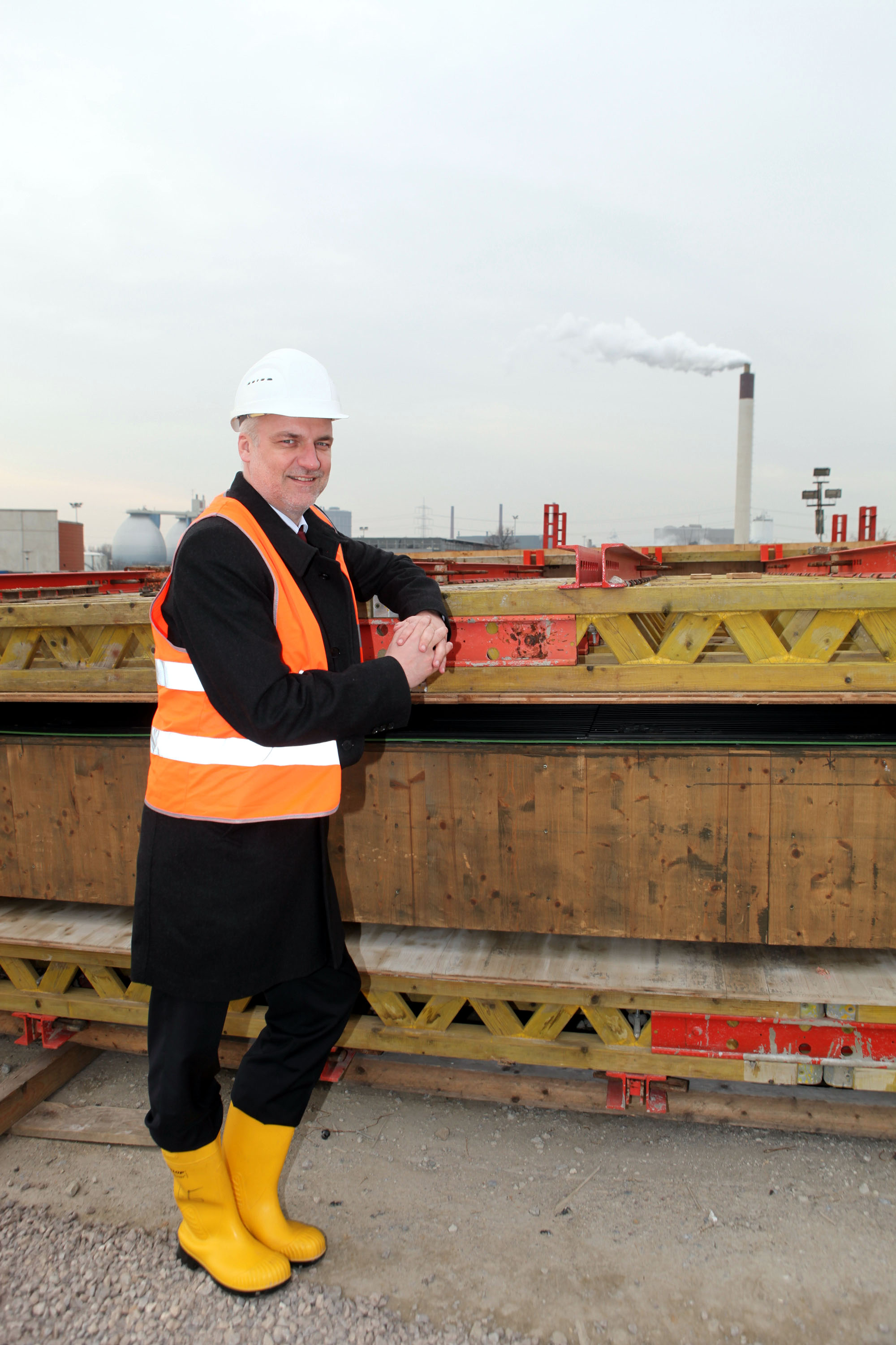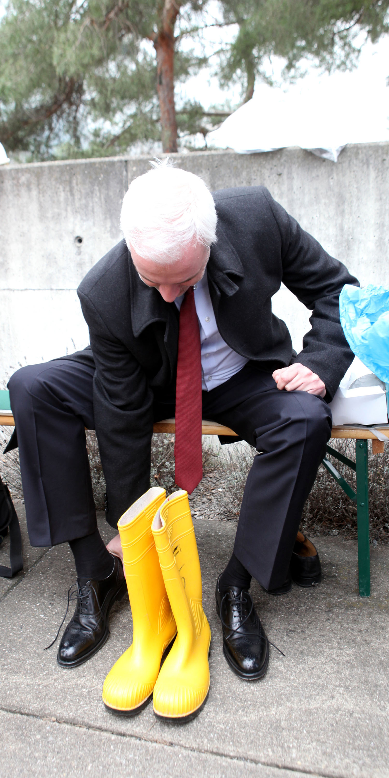 Der SPD Wirtschaftsminister in Nordrhein-Westfalen, Garrelt Duin, besuchte in Bottrop die Großbaustelle der Emscher Kläranlage. Ausgestattet mit Bauhelm und Gummistiefeln, war der Minister dann doch nicht schwindelfrei genug für die 50 Meter tiefe Baugrube. Gummistiefel ist der gebürtige Ostfriese aber von Kindesbeinen an gewöhnt. Heute lebt er auf geoßem Fuß, Schuhgröße 45 muss es mindestens sein!