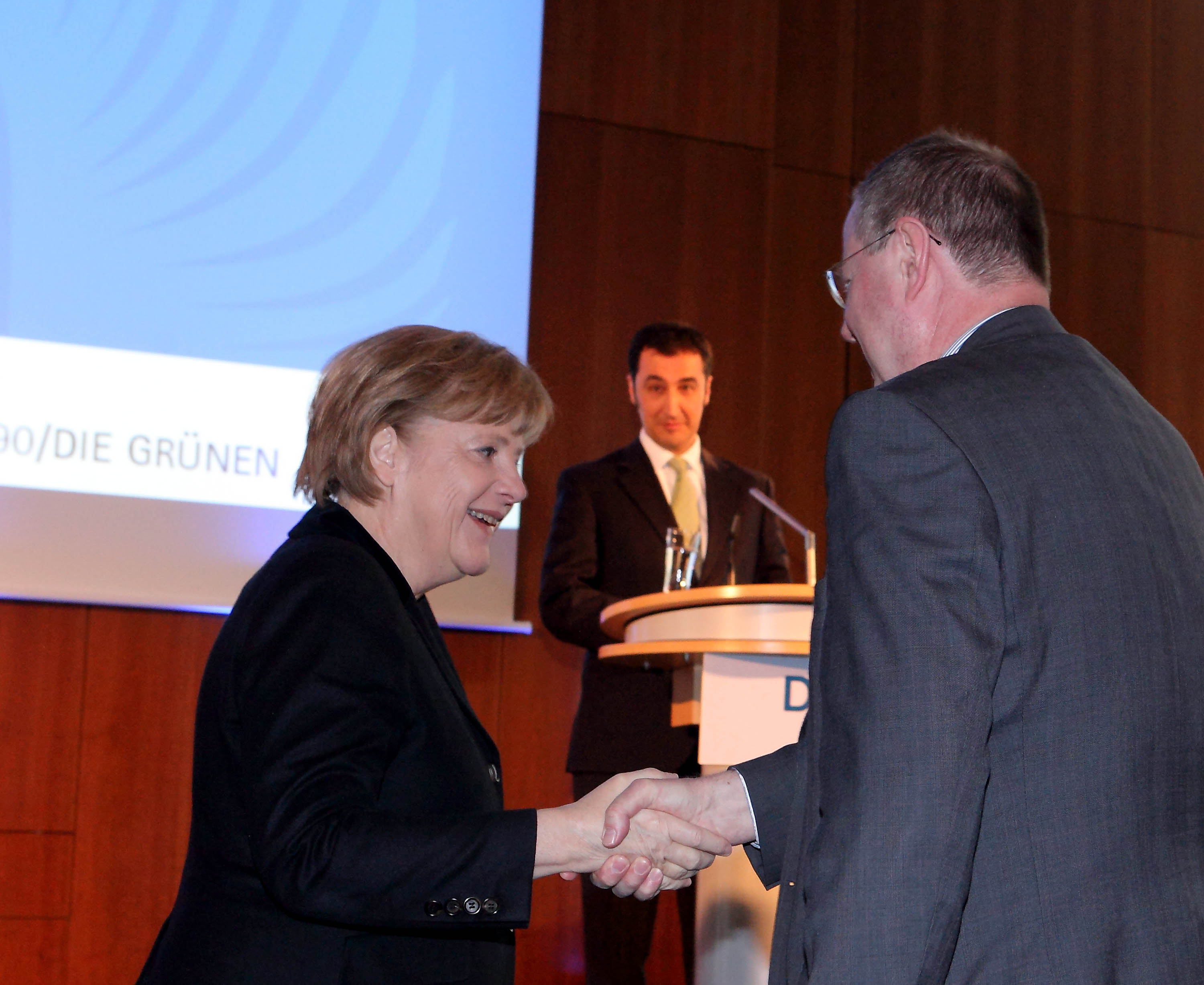 20.03.2013, Berlin, Eric Schweitzer ist neuer Praesident des Deutschen Industrie- und Handelskammertags DIHK. Die Vollversammlung wählte den 47-jährigen Berliner Unternehmer (ALBA Group) heute einstimmig zum Nachfolger von Hans Heinrich Driftmann. Zur Eröffnungsveranstaltung kamen u. a. Bundeskanzlerin Angela Merkel, SPD Kanzlerkandidat Peer Steinbrück, FDP Chef Philipp Rösler, FDP Bundestagsvizepräsident Hermann Otto Solms und Grünen Chef Cem Özdemir. Mit viel Humor wurde im Bundestagswahljahr 2013 die Wahl mit 100 % der Stimmen belächelt. Und dann kam die Kanzlerin, hoppla, schönen Tag Herr Steinbrück, und Cem Özdemir begrüßte im Namen des DIHK vom Podium höflich: „Diese Gelegenheit lasse ich mir nicht entgehen, ich stehe auf dem Podium und begrüße die Bundeskanzlerin beim DIHK recht herzlich im Namen aller Anwesenden.“