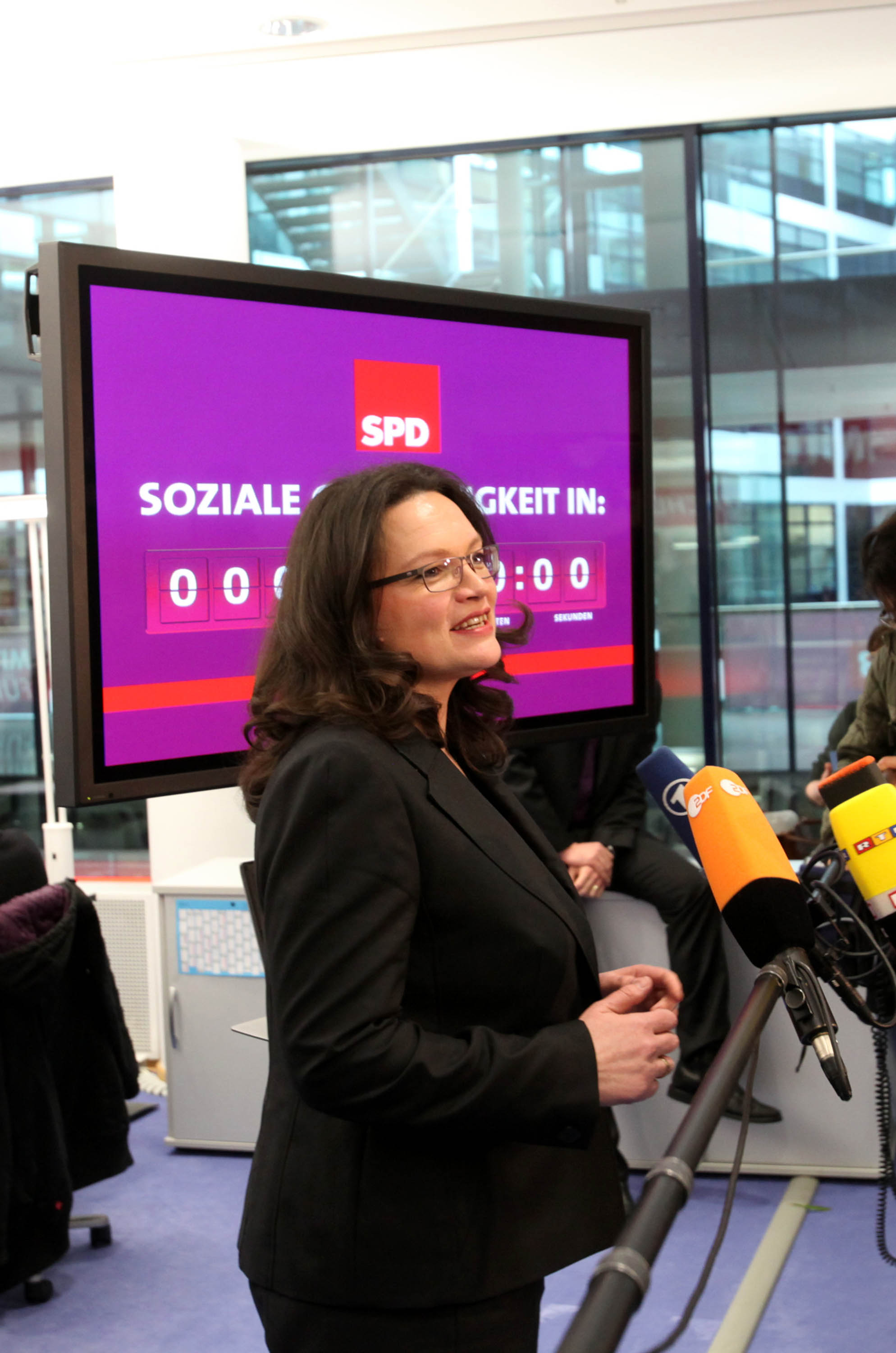 22.03.2013, Berlin, Willy Brandt Haus, SPD Generalsekretärin Andrea Nahles eröffnete heute die neue Wahlkampfzentrale der SPD zur Bundestagswahl, die sogenannte KAMPA. Beim Aktivieren der „Gerechtigkeitsuhr“ klemmte diese leider erst ein paarmal vom Laptop aus, bis sie schließlich doch planmäßig anlief. Von Grünen Geschäftsführerin Steffi Lemke bekam sie ein Balance Board geschenkt, damit sie sich fit halten kann und außerdem Rot und Grün immer in Balance bleiben.