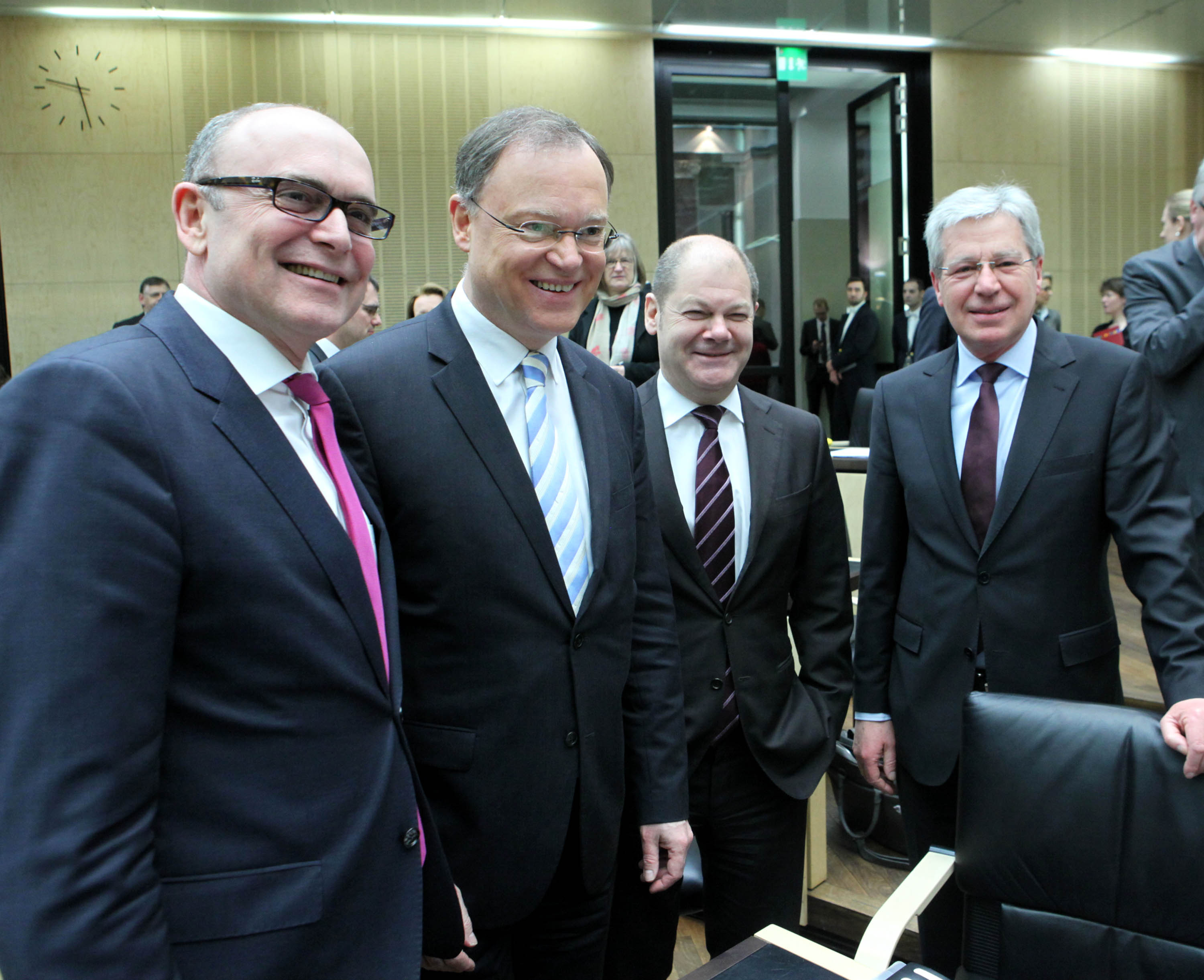 22.03.2013, Berlin, Bundesrat, mit dem neuen Ministerpräsident in Niedersachsen, Stephan Weil, aus Baden-Württemberg Winfried Kretschmann, Olaf Scholz Hamburg, Malu Dreyer aus Rheinland-Pfalz, die ihren Emotionen freien Lauf lässt, Erwin Sellering, Mecklenburg-Vorpommern, im Gruppenbild mit den anderen aus dem Norden, Jens Böhrnsen, Bremen; und Klaus Wowereit, der Horst Seehofer launig begrüßte: „Ach, da ist ja mein großer Sponsor!“ Daraufhin konterte Seehofer prompt: „Nee, das stimmt so nicht. Ein Sponsor überweist nur einmal Geld, aber wir überweisen immer wieder, und zwar Millionen um Millionen!“