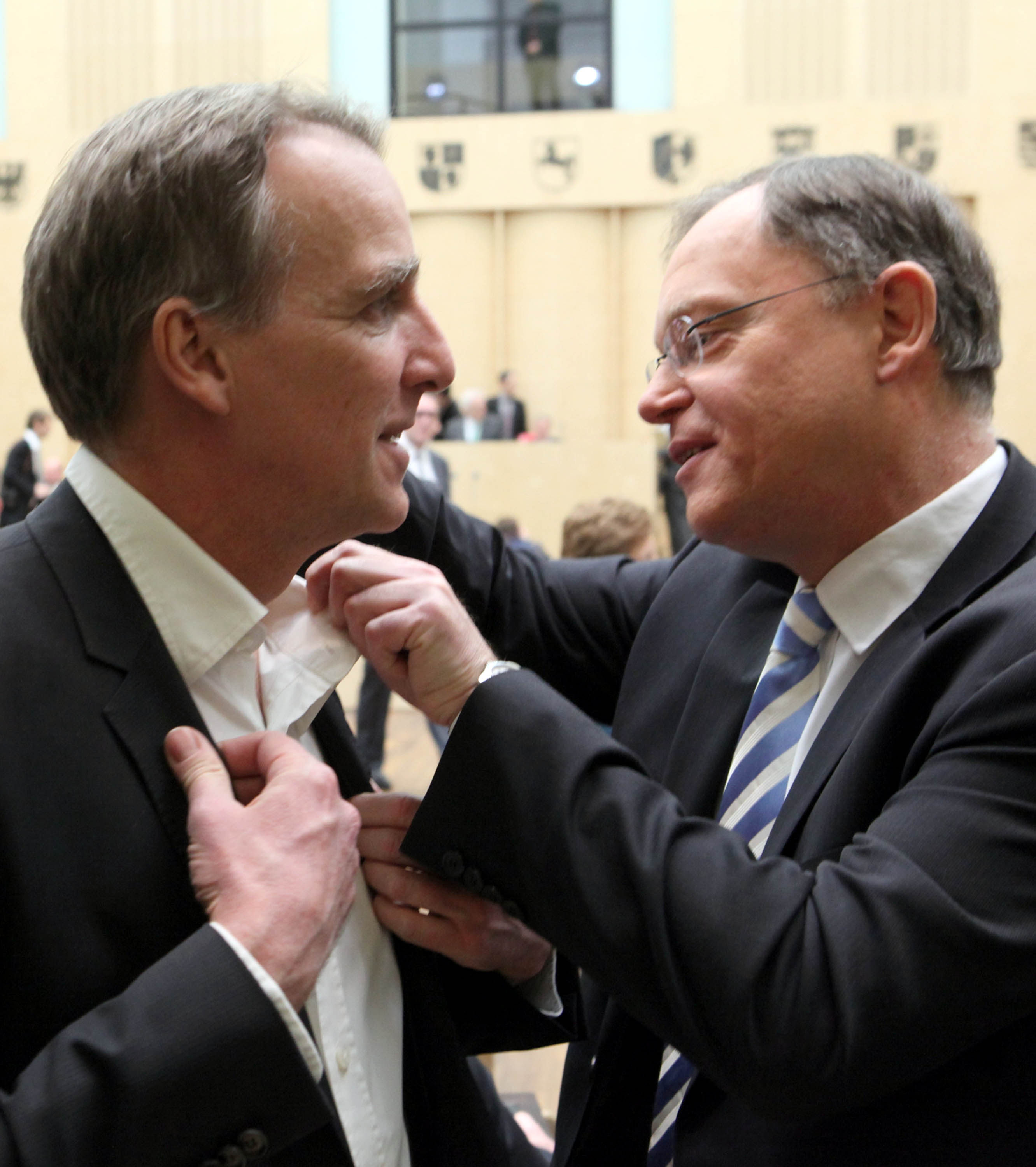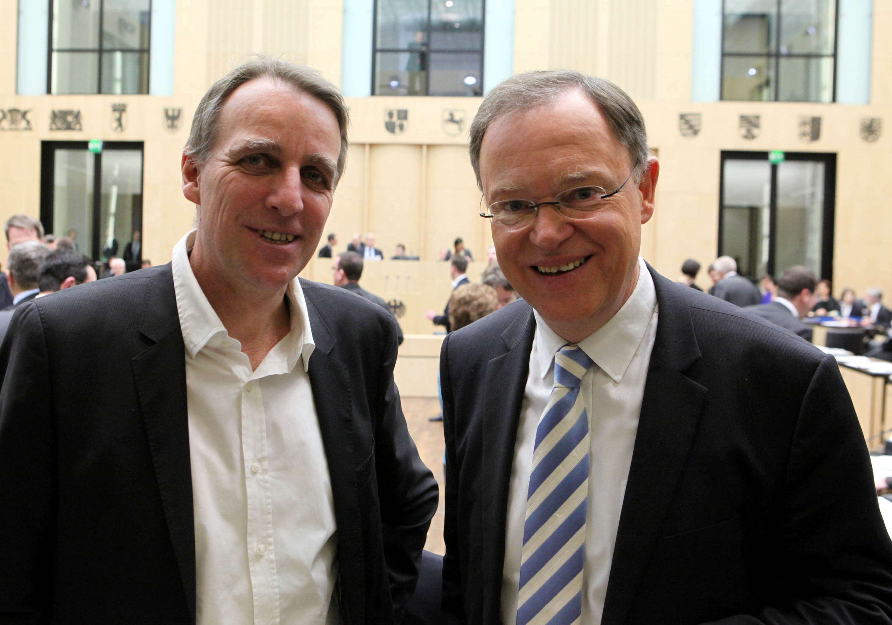 22.03.2013, Berlin, Bundesrat, mit dem neuen Ministerpräsident in Niedersachsen, Stephan Weil, der seinen wie immer schlipslosen grünen Stellvertreter Stefan Wenzel fragt: „Hast du eigentlich überhaupt jemals eine Krawatte besessen?“ Dieser stand Rede und Antwort: „Ja, weißt Du doch, für unseren Kinofilm.“