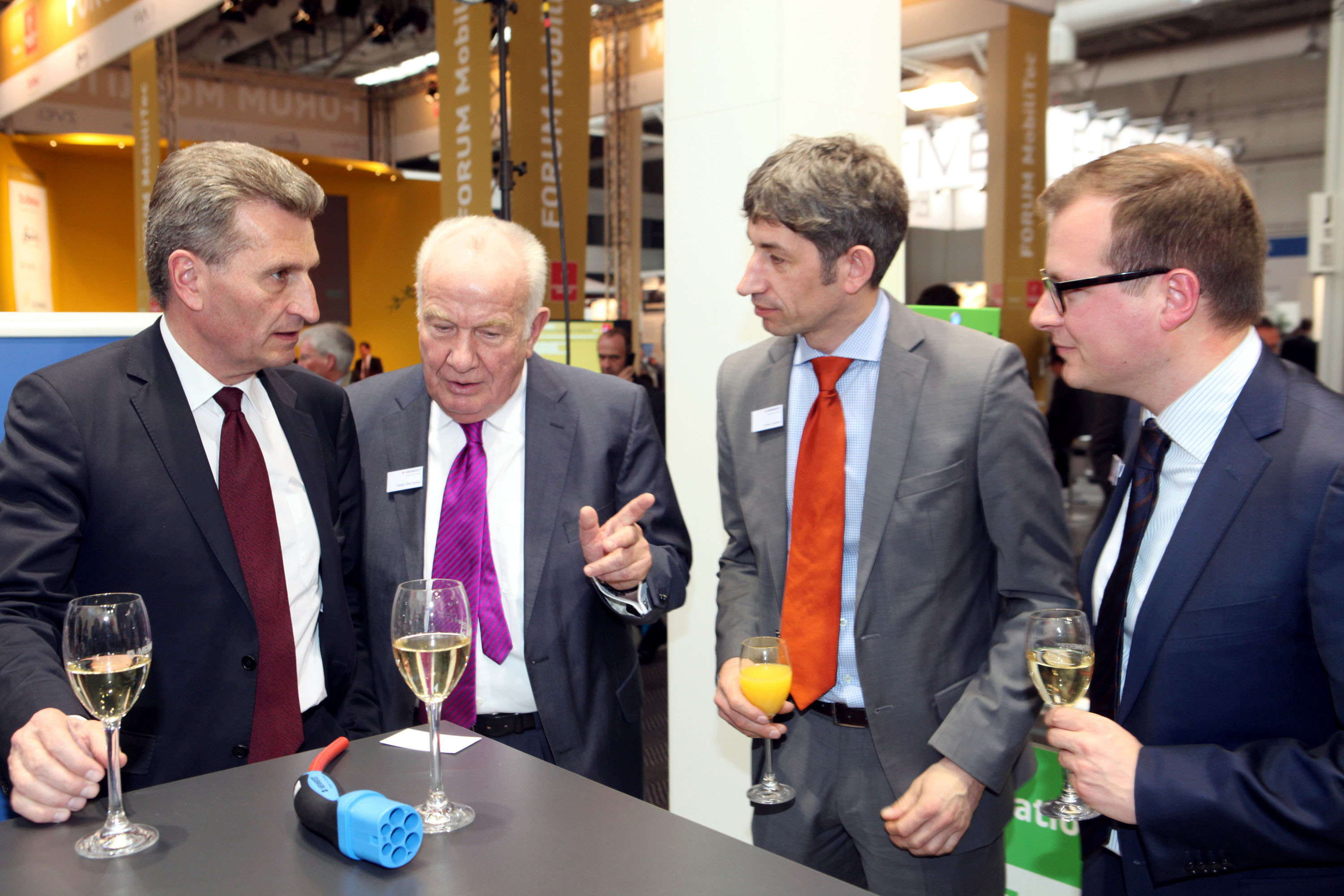 Hannover Messe, Niedersachsen, Halle 25, Stand der Firma Mennekes aus Kirchhundem im Sauerland, Firmenchef Walter Mennekes empfängt EU Energiekommisar Günther Oettinger zur Präsentation des von Mennekes entwickelten Typ 2 Ladesteckers fuer Autos. Plug and Charge, mit ID Karte, alles sicher und hocheffizient. Oettinger probiert die Neuheiten alle selber aus und überzeugt sich begeistert von der modernen Zweckmäßigkeit der zukunftsorientierten Technik – eben „plugs for the world“!