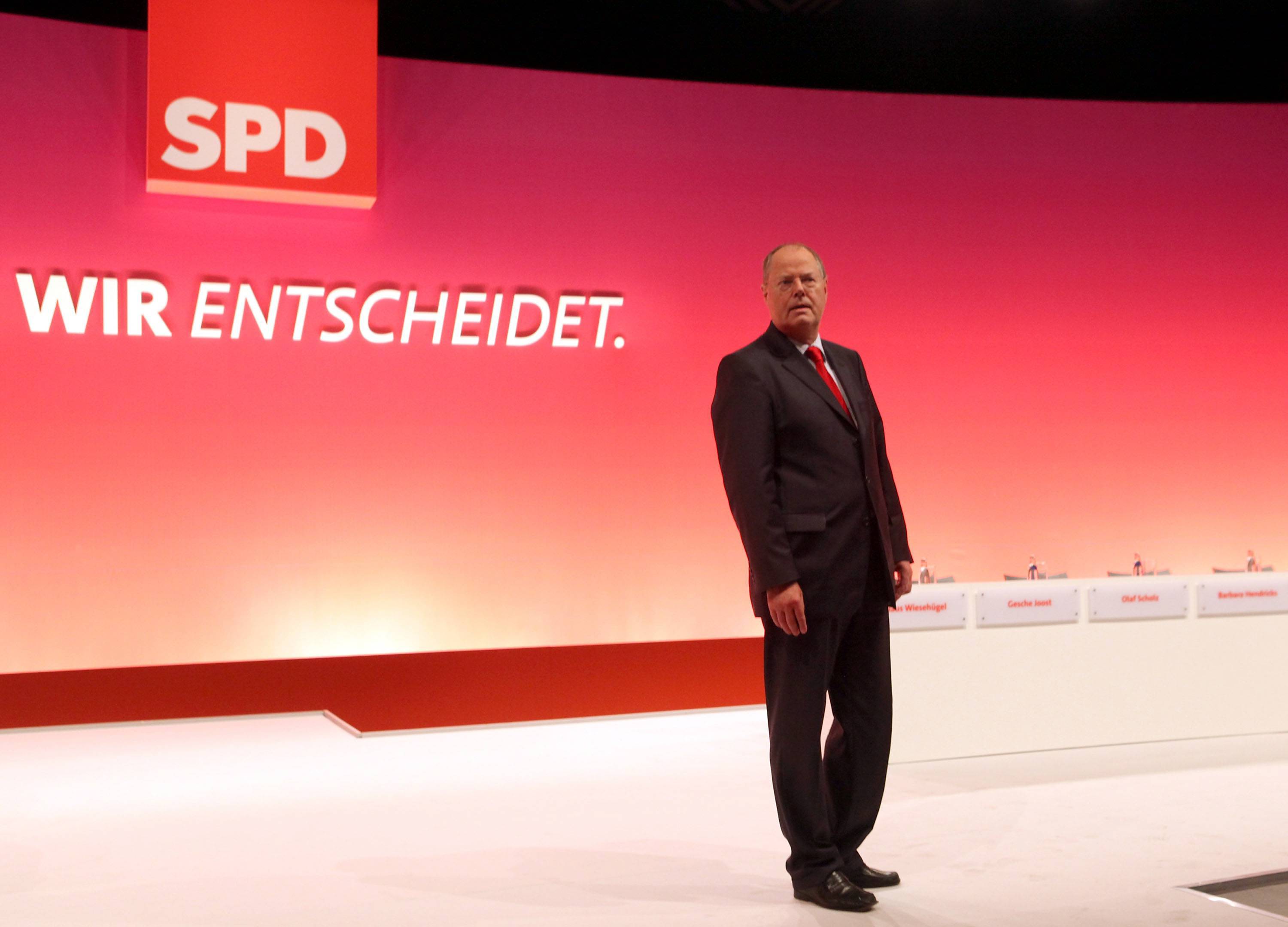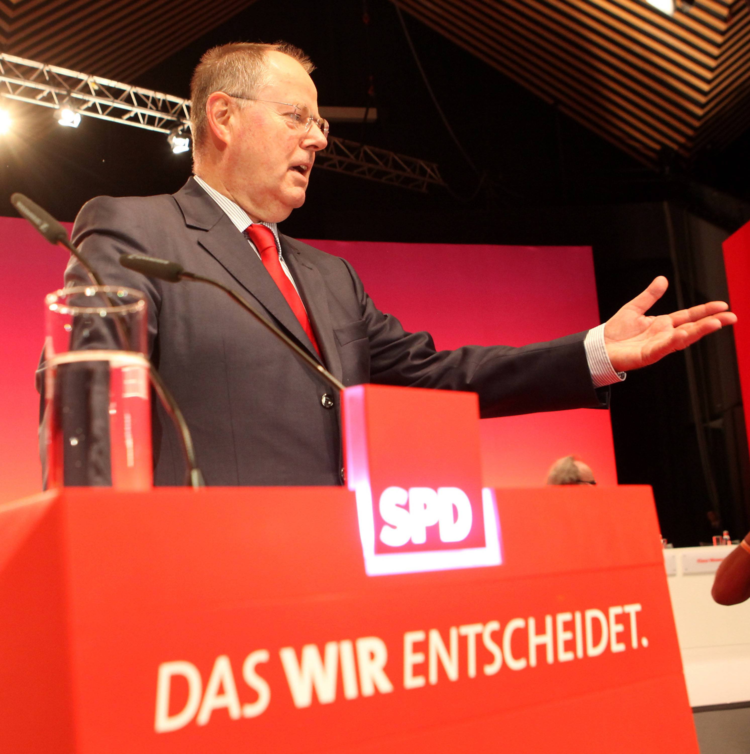 SPD Parteikonvent im Berliner Tempodrom. Kurz bevor SPD-Kanzlerkandidat Peer Steinbrück bei einer Podiumsdiskussion nach einer Bemerkung seiner Ehefrau Gertrud die Fassung verlor und mit den Tränen kämpfte, war hier für ihn die Welt noch in Ordnung. Tough und straight wie gewohnt und das Glas immer halb voll für den Optimisten präsentierte er sich auf der Bühne und am Rednerpult. Generalsekretärin Andrea Nahles wollte ihre Handtasche auch dann nicht loslassen, als Steinbrück sie freundschaftlich heranwinkte und in den Arm nahm.
