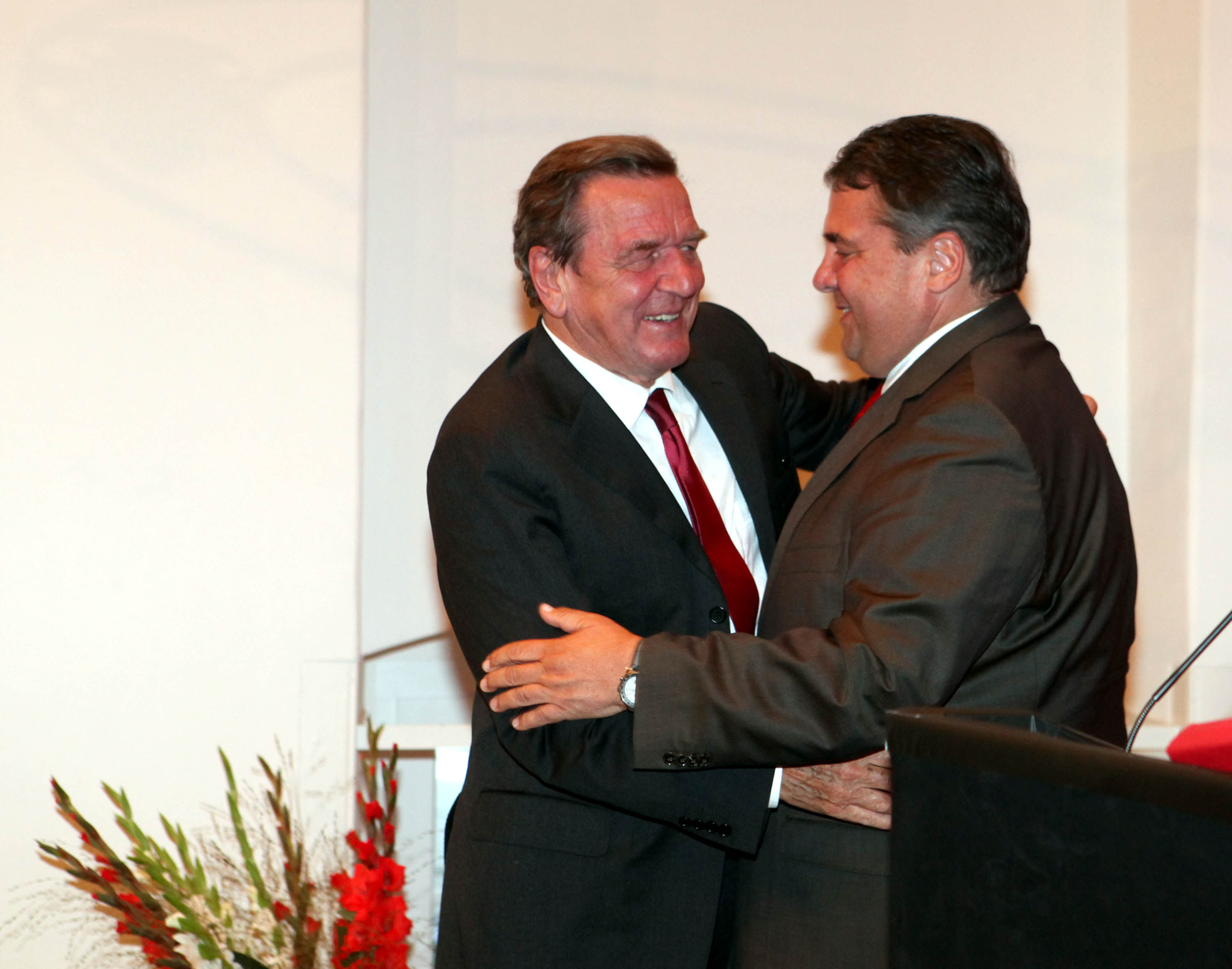 Der SPD-Bundesvorsitzende Sigmar Gabriel ehrte Altbundeskanzler Gerhard Schröder für seine 50-jährige Parteimitgliedschaft.