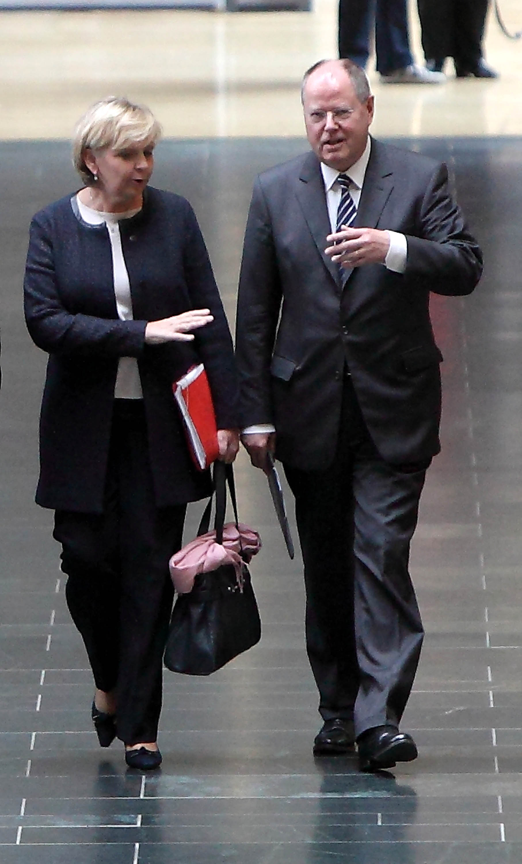 17.10.2013, Berlin, Deutsche Parlamentarische Gesellschaft DPG. Nachdem schwarz-grün im Bund gescheitert ist, trafen sich CDU/CSU und SPD zu einem dritten Sondierungsgespräch zur Anbahnung einer großen schwarz-roten Koalition. Für die CDU/CSU nahmen teil: Bundeskanzlerin und Parteivorsitzende Angela Merkel, Fraktionsvorsitzender Volker Kauder, Generalsekretär Hermann Gröhe, Volker Bouffier, Ministerpräsident Hessen, Bundesfinanzminister Wolfgang Schäuble, Kanzleramtsminister Ronald Pofalla und der sächsische Ministerpräsident Stanislaw Tillich, Alexander Dobrindt, Gerda Hasselfeldt, Hans-Peter Friedrich, Horst Seehofer, Barbara Stamm, Ilse Aigner. Für die SPD nahmen teil Parteichef Sigmar Gabriel, Peer Steinbrück, Frank-Walter Steinmeier, Thomas Oppermann, Olaf Scholz, Manuela Schwesig, NRW-Ministerpräsidentin Hannelore Kraft, Generalsekretärin Andrea Nahles, Barbara Hendricks.