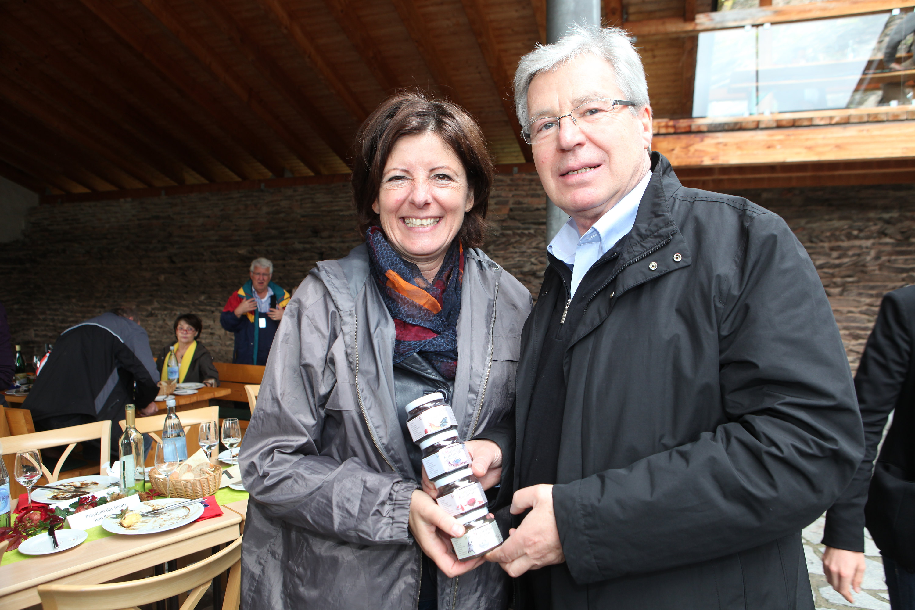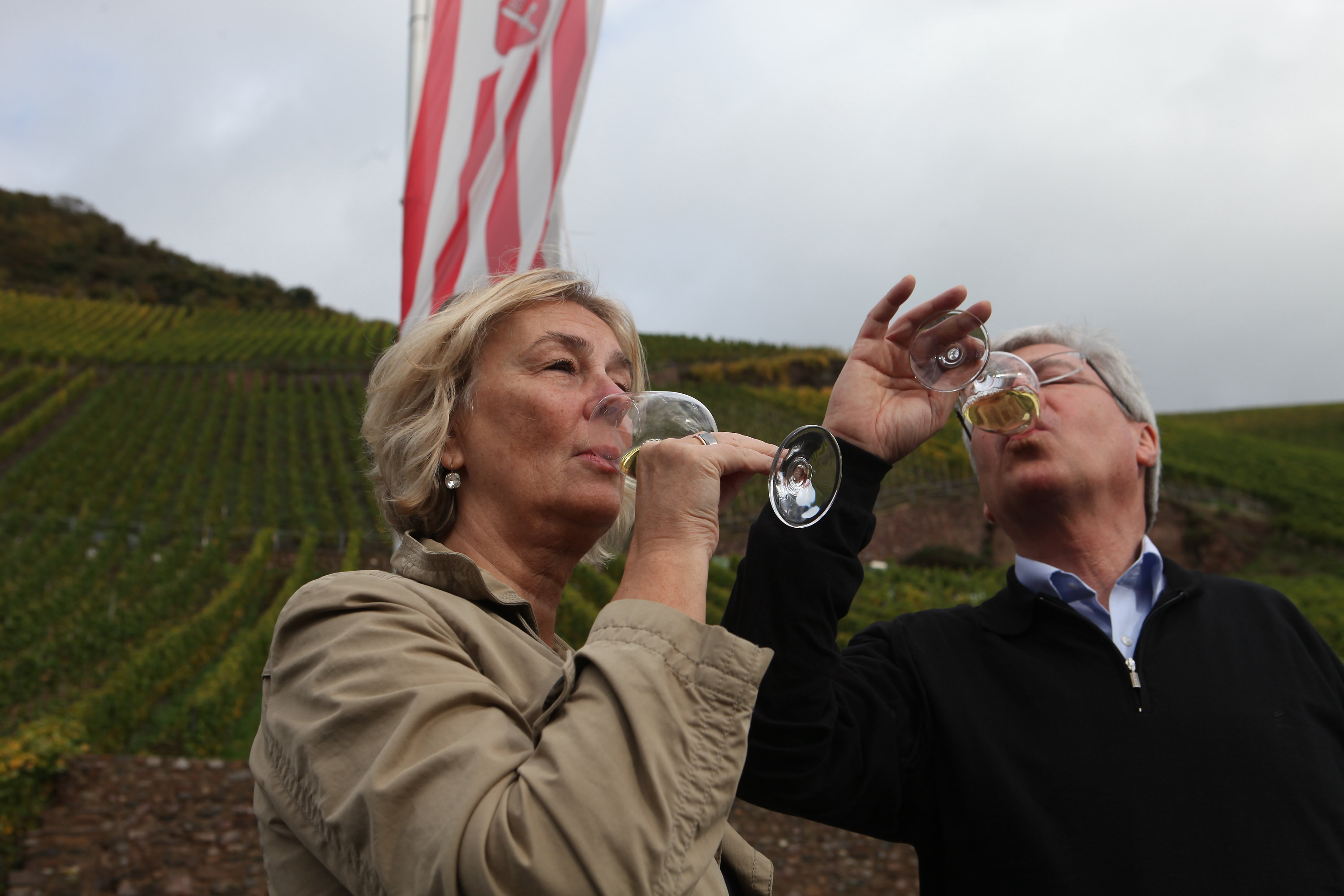 26.10.2013, Germany, Ürzig, Mosel, Rheinland-Pfalz, Bremen, Ein Besitz des Landes Bremen an der Mosel, genauer, einen Weinberg. Seit Jahren ist der Wein von dieser Steillage der Standartwein des Martinshofes, dem Bremer Gastronomie Aushängeschild. Bürgermeister Jens Böhrnsen und Ehefrau Birgit Rüst waren heute zusammen mit der Ministerpräsidenten Malu Dreyer in der Weinernte. Der Regen verschwand, und bei strahlender Oktobersonne gab es viel Arbeit auf einem Stück Bremer Erde. Ein Riesling der Extraklasse soll es auch dieses Jahr werden. Neben der strahlenden Malu Dreyer waren auch dabei der Bremer Ratskellermeister Karl Josef Kroetz, Leo Waechter von der Verbandsgemeinde, Arno Simon, Bürgermeister aus Ürzig und der Meisterkoch des Zeltinger Hofes Markus Petz. Die Ministerpräsidentin erhielt dabei die Hochoffizielle Konfituere des Landesbremen und sie gab zu, das sie auch dabei eine Süsse ist. Auch vor Schokolade macht sie nicht halt.