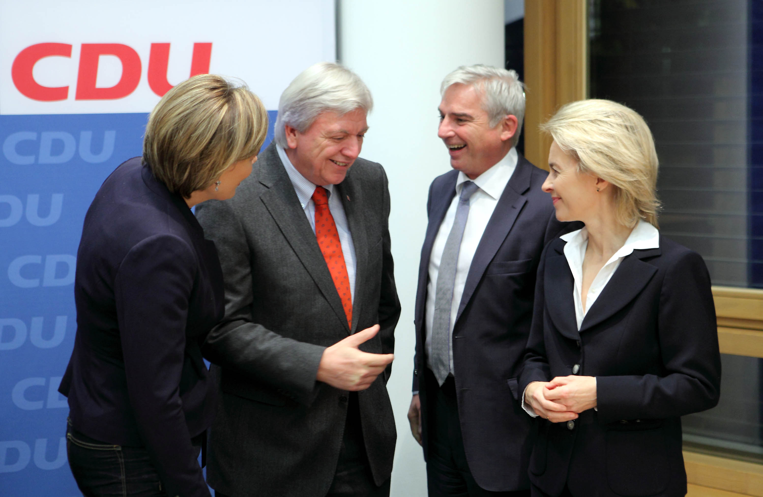 27.11.2013, Berlin, Konrad Adenauer Haus, Bundesvorstandssitzung der CDU mit Bundeskanzlerin Angela Merkel, Ministerpräsident Volker Bouffier aus Hessen, Julia Klöckner, Thomas Strobl, Hermann Gröhe, Ursula von der Leyen, Philipp Missfelder. Die Stimmung ist gut, nachdem am Vormittag die erste Hürde beim Koalitionsvertrag genommen wurde.