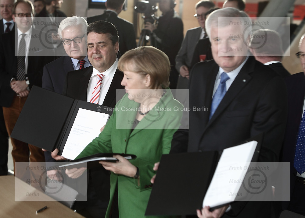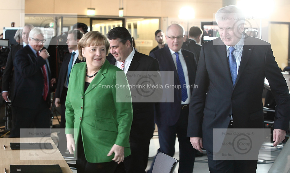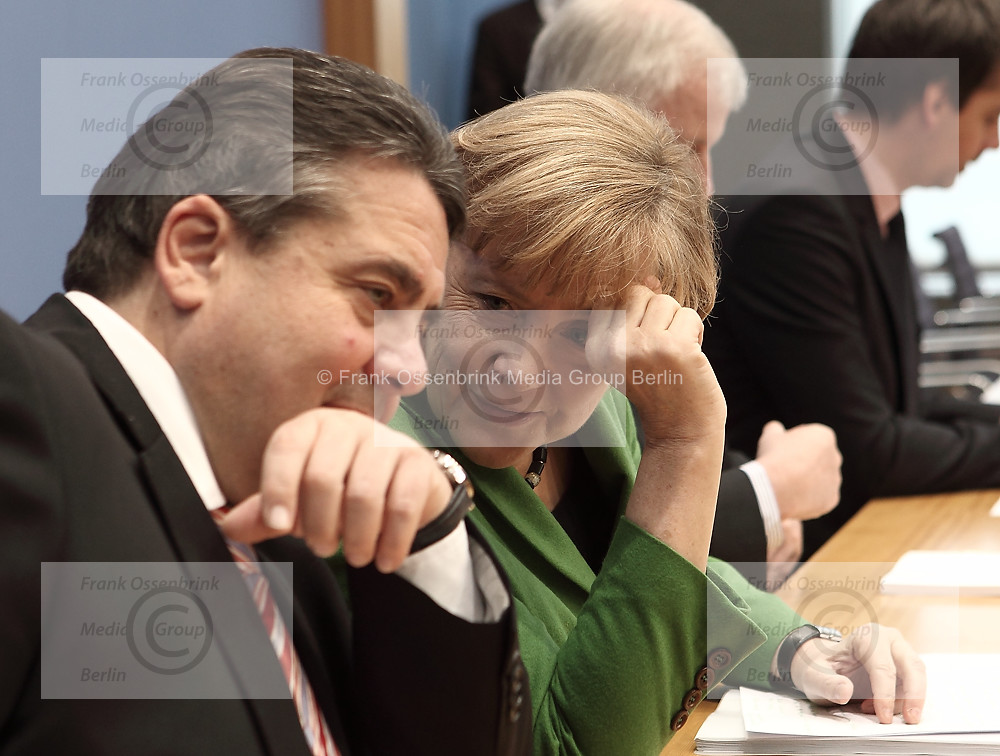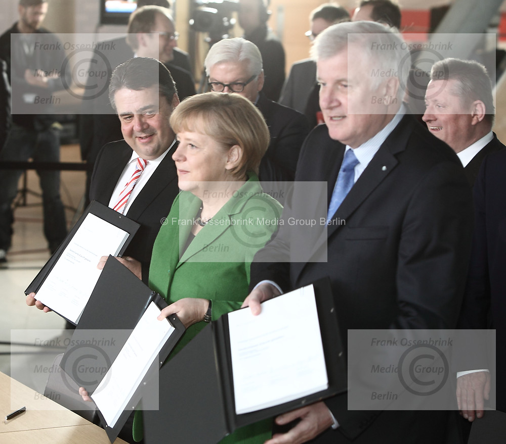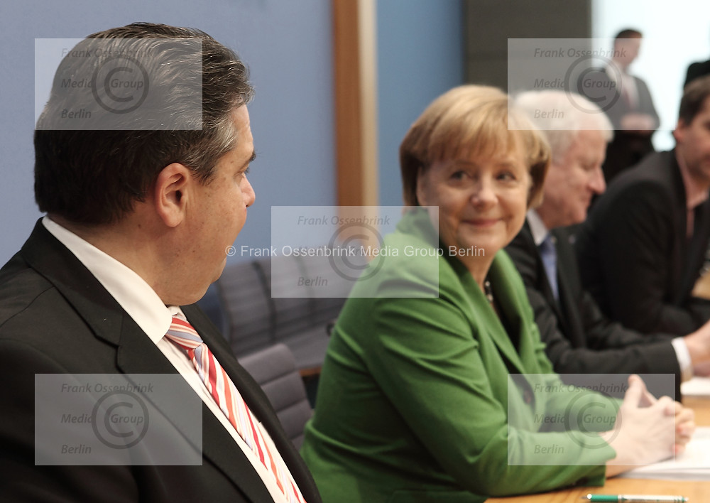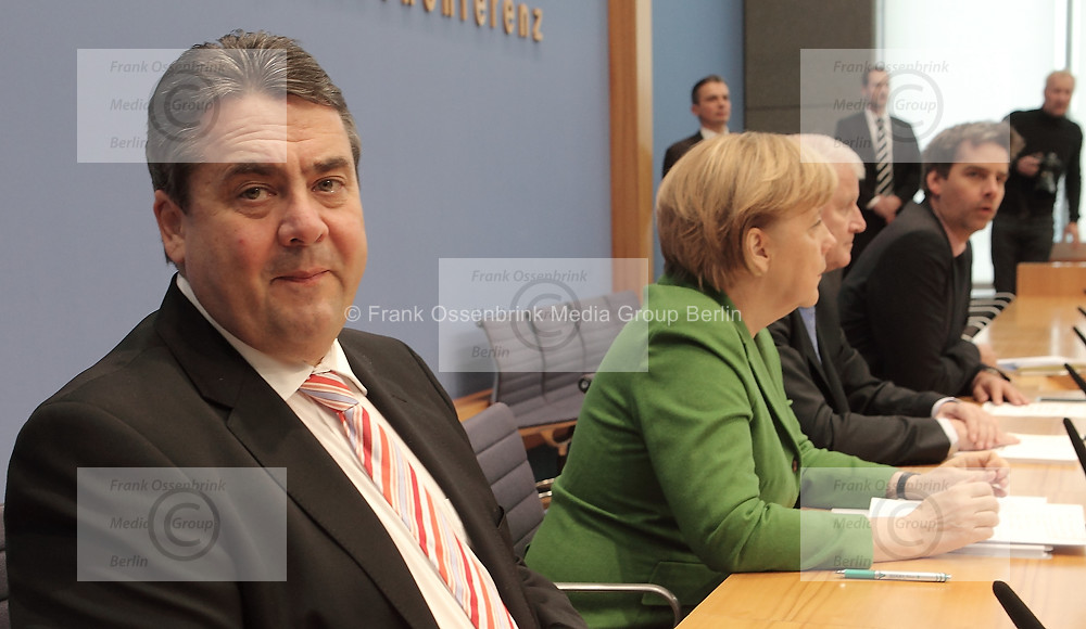 27.11.2013, Berlin, Seit 7 Uhr morgens steht der Koalitionsvertrag. Aber es gibt viel redebedarf vor der vorläufigen Unterschrift im Bundestag zwischen den Parteivorsitzenden Merkel, Gabriel und Seehofer. So viel, das Sigmar Gabriel gar nicht aufhört, mit der Bundeskanzlerin zu tuscheln. In der Bundespressekonferenz ging dies dann weiter so. Seehofer hat dagegen wenig seinen Partnern zuzunuscheln. Wenn er was flüstert, dann mit Vorliebe seinem Alexander Dobrindt. Aber es gibt eine neue Flüsterkultur in Deutschland. Hielt man noch in der Antike und im Mittelalter seinen Getreuen hinter vorgehaltener Hand die Nachricht parat, so wird dies jetzt mit tiefhängenden Augenliedern erledigt. Bei dieser Art der menschlichen Näherung scheint es jede Menge frischen Atem zu geben.