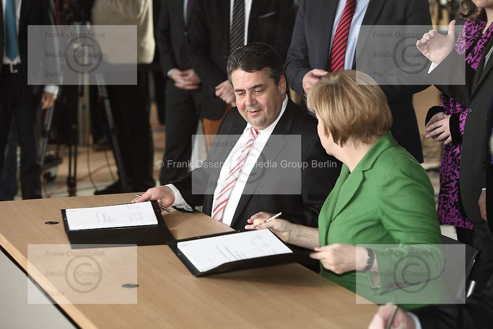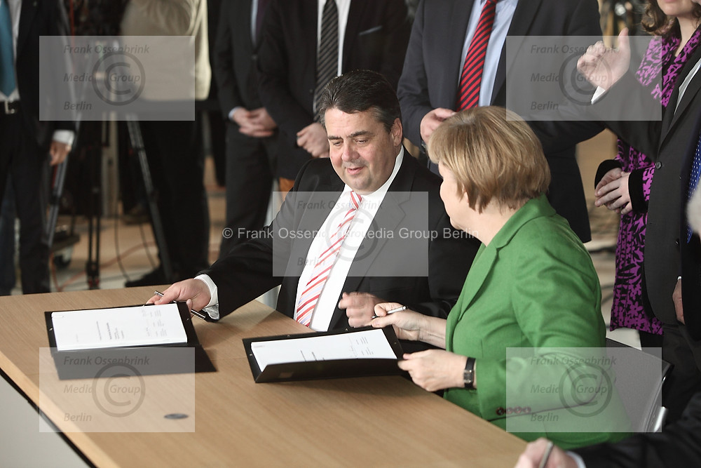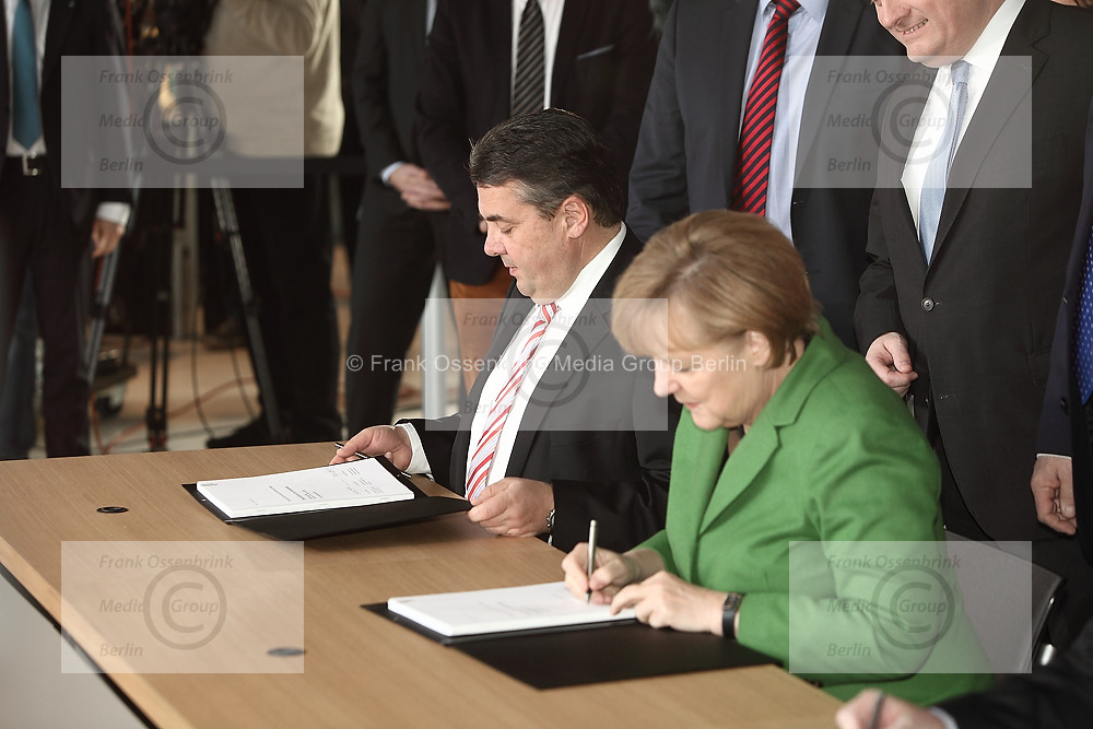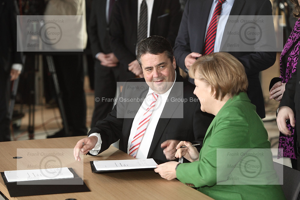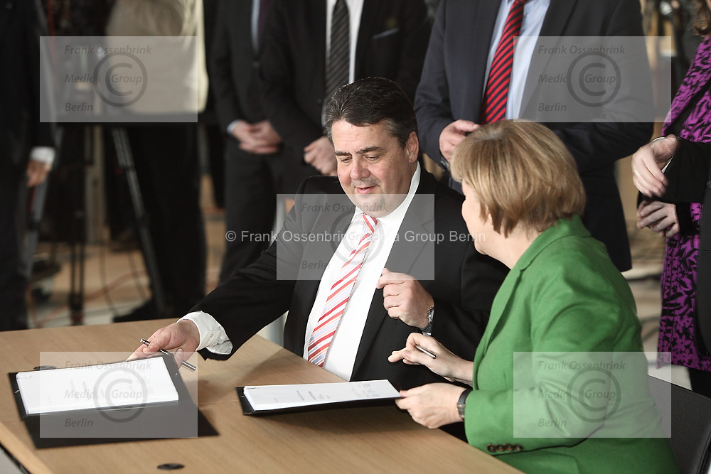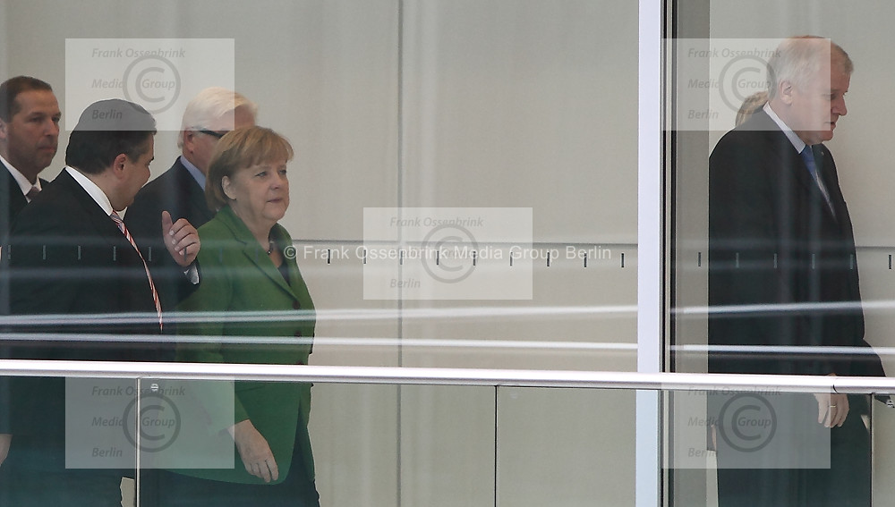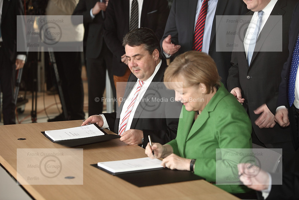 27.11.2013, Berlin, Seit 7 Uhr morgens steht der Koalitionsvertrag. Aber es gibt viel redebedarf vor der vorläufigen Unterschrift im Bundestag zwischen den Parteivorsitzenden Merkel, Gabriel und Seehofer. So viel, das Sigmar Gabriel gar nicht aufhört, mit der Bundeskanzlerin zu tuscheln. In der Bundespressekonferenz ging dies dann weiter so. Seehofer hat dagegen wenig seinen Partnern zuzunuscheln. Wenn er was flüstert, dann mit Vorliebe seinem Alexander Dobrindt. Aber es gibt eine neue Flüsterkultur in Deutschland. Hielt man noch in der Antike und im Mittelalter seinen Getreuen hinter vorgehaltener Hand die Nachricht parat, so wird dies jetzt mit tiefhängenden Augenliedern erledigt. Bei dieser Art der menschlichen Näherung scheint es jede Menge frischen Atem zu geben.