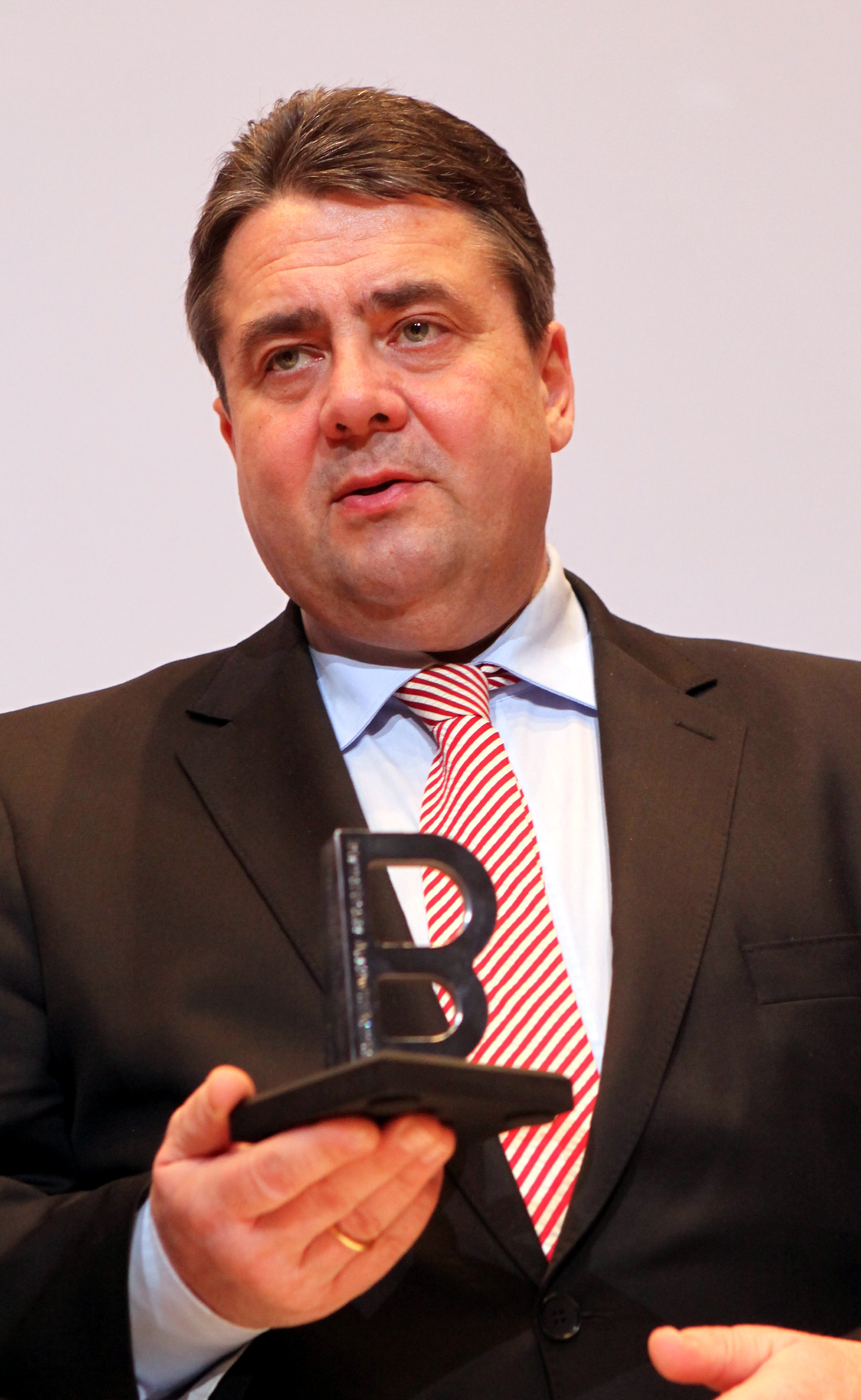 27.01.2014, Berlin, Willy Brandt Haus, Sigmar Gabriel erhält Ehrung des Internationalen Auschwitz Komitees. Anlässlich des Internationalen Holocaust Gedenktages verleiht das Internationale Auschwitz Komitee IAK dem SPD-Vorsitzenden Sigmar Gabriel die Statue der Erinnerung „B“. Sie ist eine Auszeichnung für Persönlichkeiten, die sich in ihrem Wirken besonders für die Erinnerungsarbeit und die Stärkung der Demokratie gegen Rechtsextremismus, Rassismus und Antisemitismus eingesetzt haben. Christoph Heubner, Exekutiv Vizepräsident des IAK, überreichte die Statue zusammen mit den