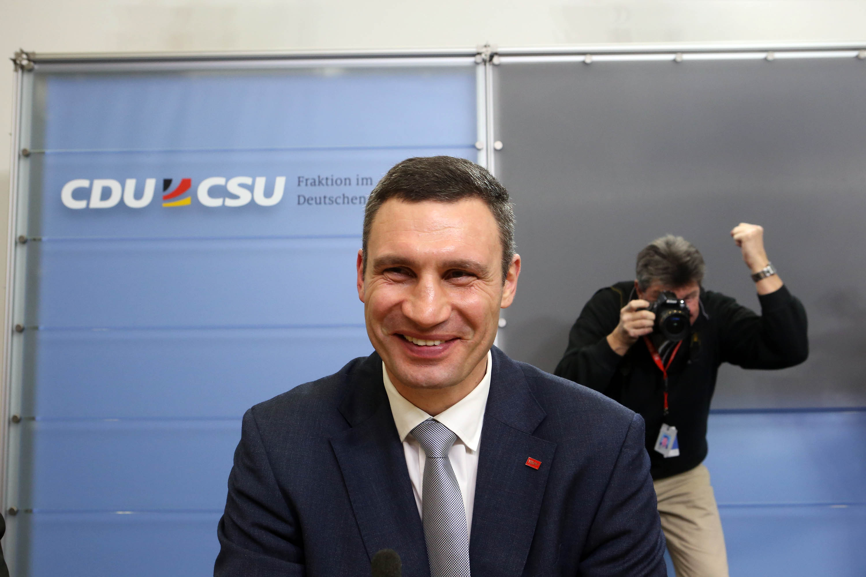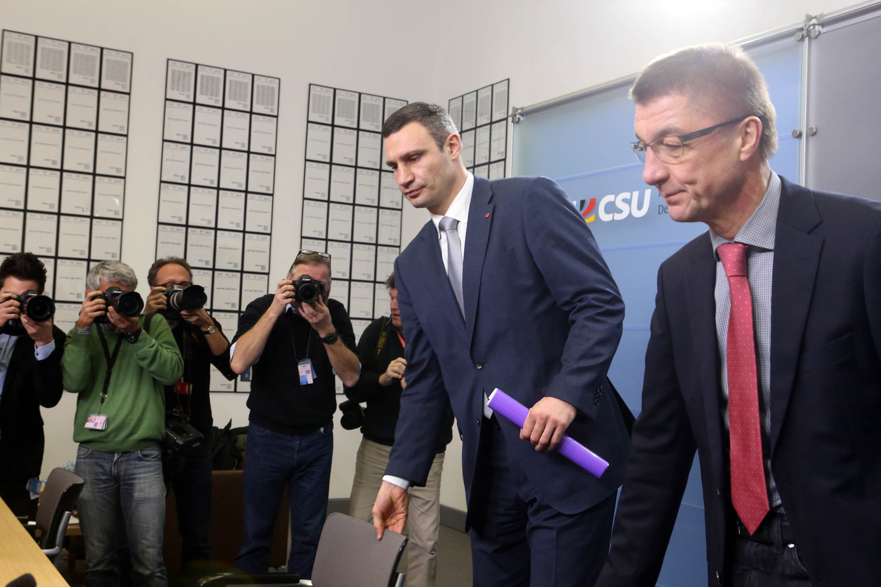 17.02.2014, Berlin, Pressekonferenz Bundestag, CDU Dr. Andreas Schockenhoff und Arsenij Jazenjuk, Vorsitzender der Partei „Vaterland“ im ukrainischen Parlament, und Vitali Klitschko, Vorsitzender der Partei UDAR, geben nach dem Besuch bei der Kanzleramt ein Statement im Reichstag ab.