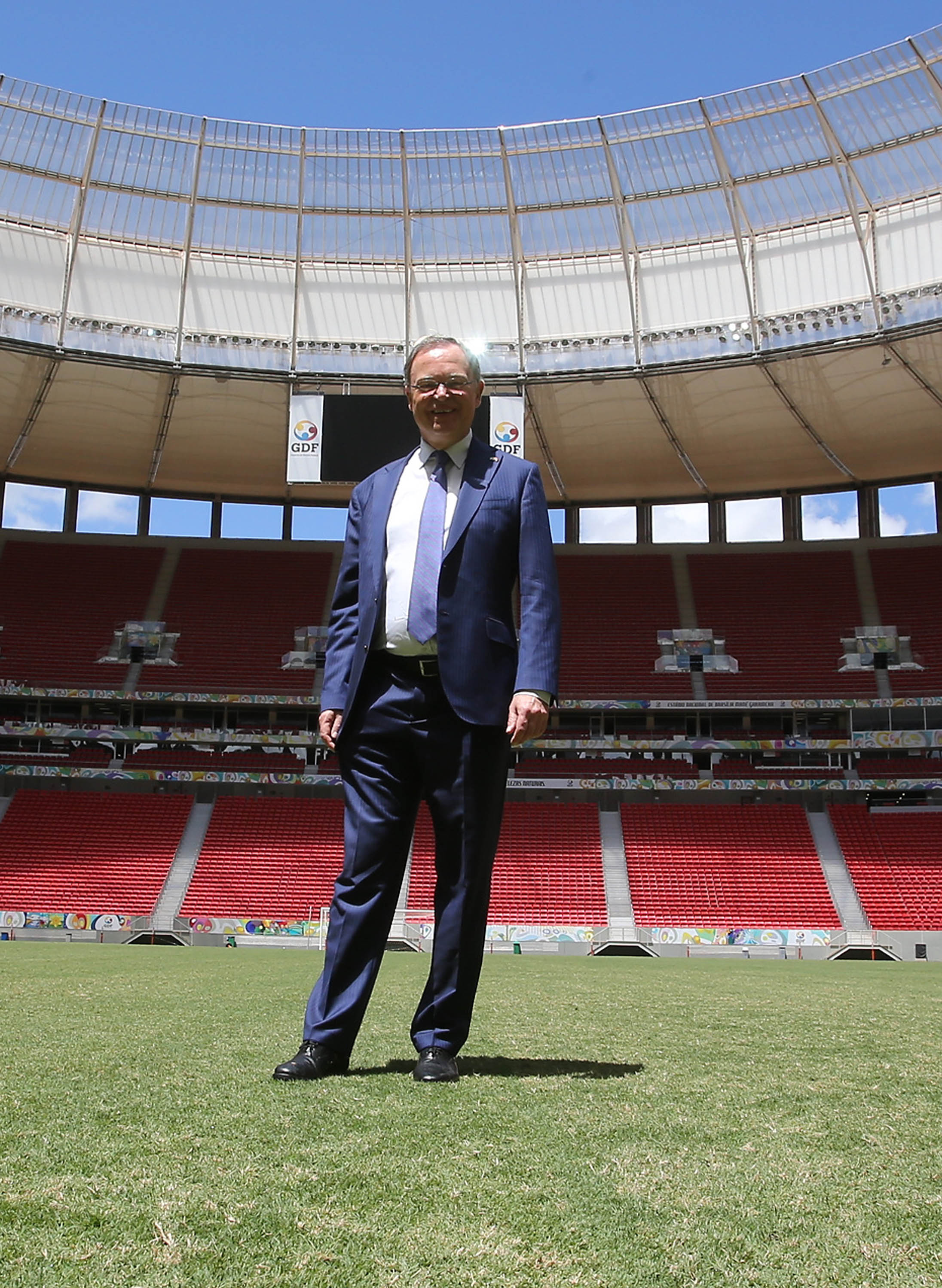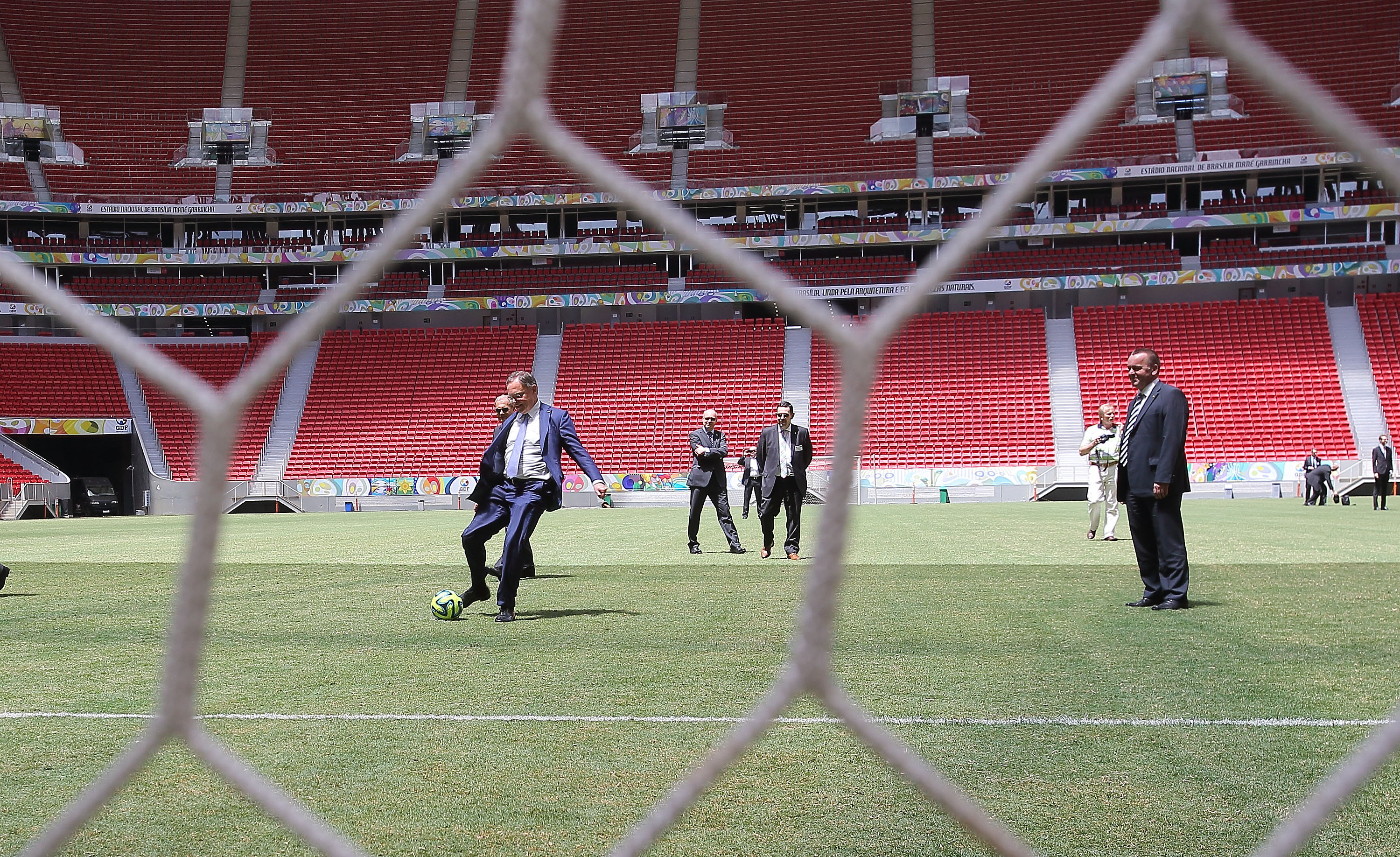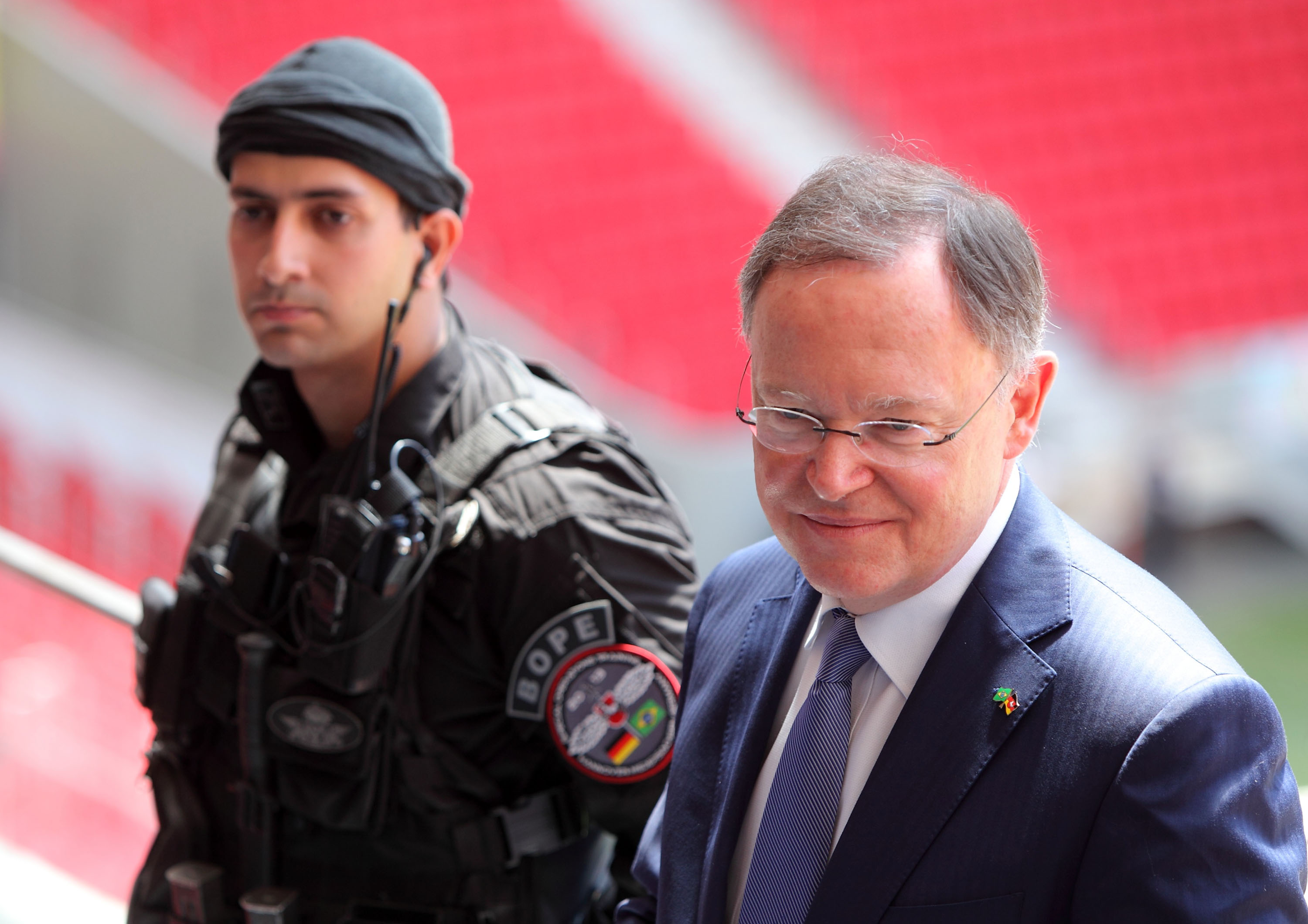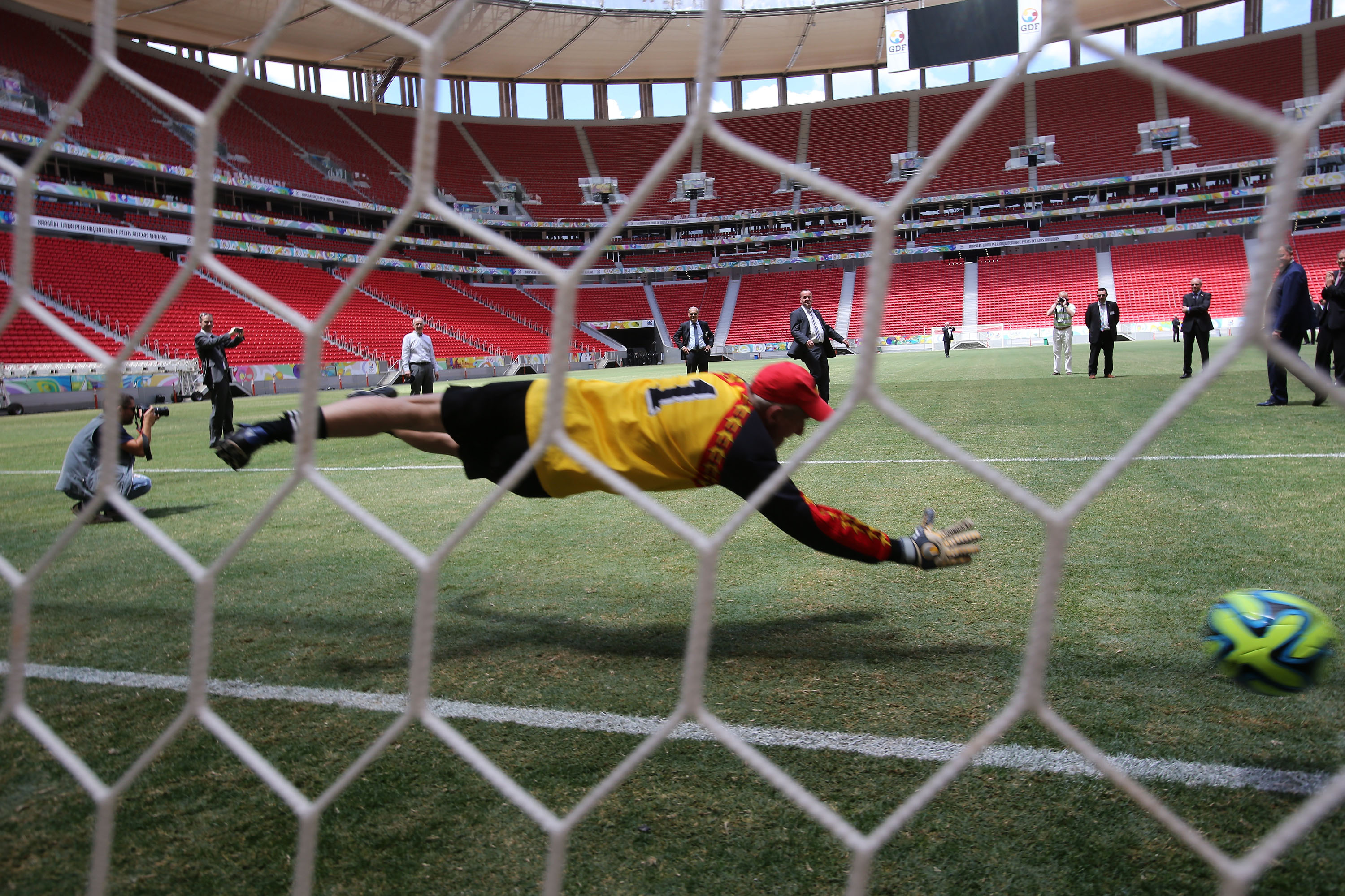 19.03.2014, Brasilien, Südamerika, Bundesratspräsident und Niedersächsischer Ministerpräsident Stephan Weil SPD zu Besuch in Brasilia, hier im Stadion Estadio Nacional Mané Garrincha. Innenminister Boris Pistorius und Stephan Weil informieren sich zum Stand der WM-Vorbereitung, zum Thema Sicherheit, Weiterbildung von brasilianischen Spezialkraeften der BOPE (Batalhao Operacoes Policais Especais) in Vorbereitung auf die Fussball WM 2014 und die Olympischen Spiele 2016. Im Rahmen der WM werden 7 Spiele in diesem Stadion stattfinden. Stephan Weil schiesst auf den Torwart der Mannschaft der deutschen Botschaft in Brasilia, den ehemaligen JuSo-Vorsitzenden und jetzigen Agrarattaché Martin Nissen.
