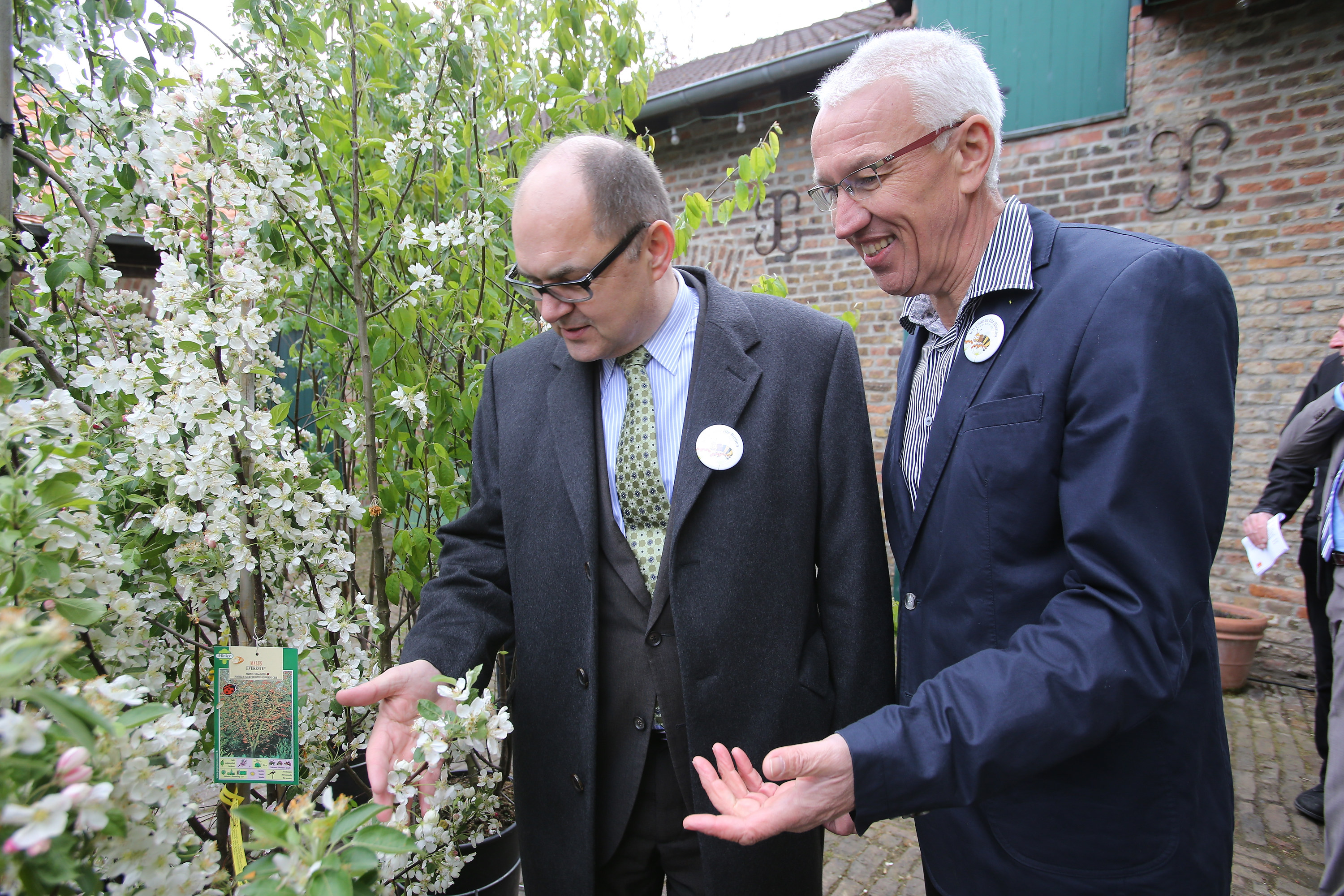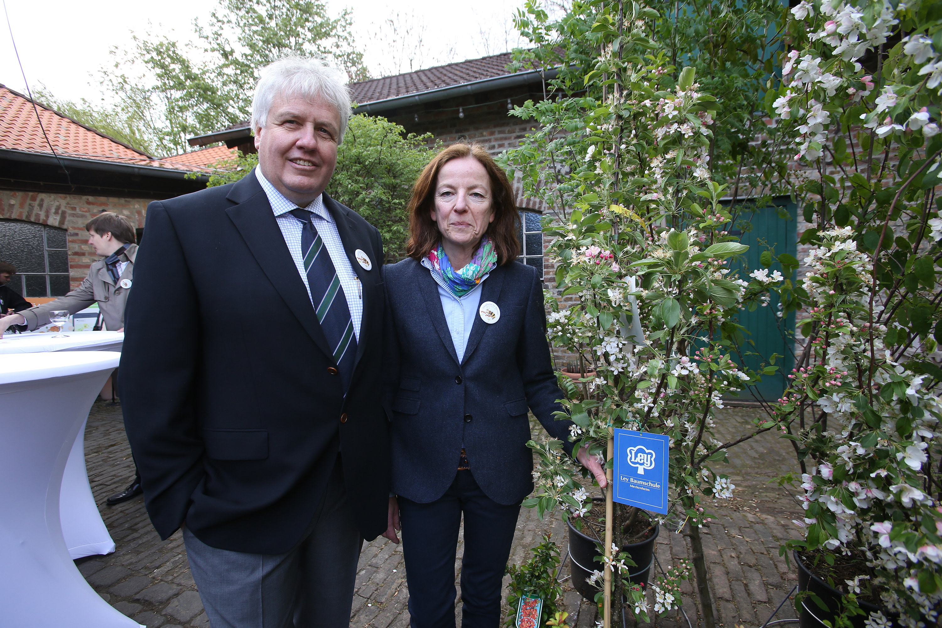 15.04.2014, Germany, Meckenheim, NRW, Bundeslandwirtschaftsminister Christian Schmidt stellt die Aktion Jetzt Bienen füttern vor auf dem Hof der Familie Wolfgang Ley, einem der besten Spezialisten in der Aufzucht von Hölzern für Garten und Anlagenbereich. Bm Schmidt zeigte sich beeeindruckt, um ihn herum war eine ordentliche Anzahl an Buergermeistern, kurz vor der Kommunalwahl, angesammelt. Ausser der Landtagsabgeordneten der CDU hatte man aber bei einer Bienenaktion vergessen , weitere Frauen einzuladen. So bleibt selbst bei staerkstem Bemuehen von Pressestellen und einer eigens eingekauften Agentur fuer den Event festzuhalten: Bienen sind Maennersache! Mit dabei neben Familie Wolfgang und Ursula Ley, der Geschaeftsführer des Verbandes der Gartenbaucenter , Harald Botz.