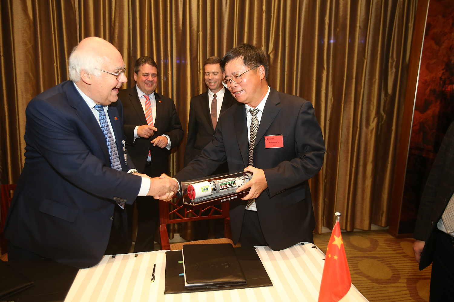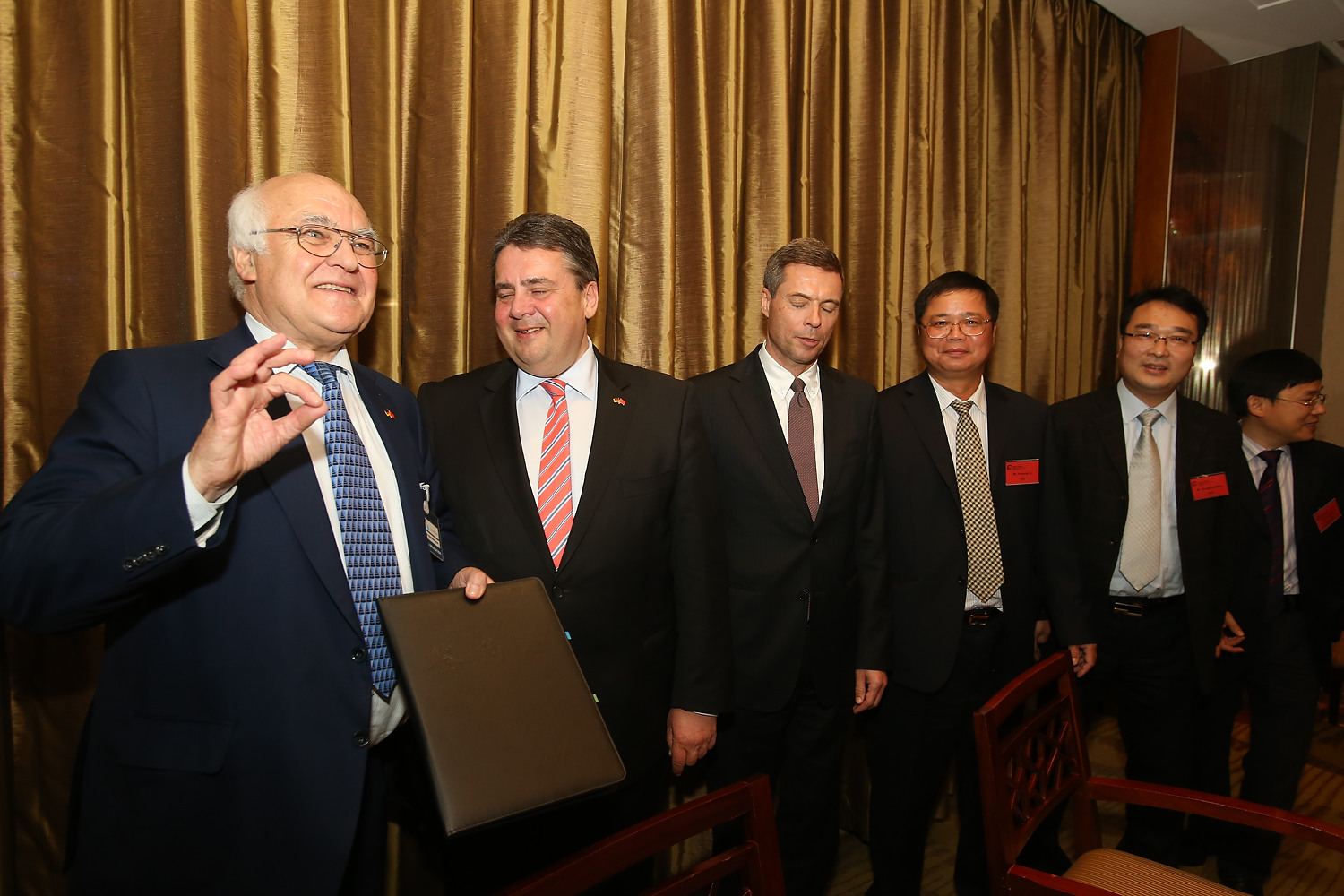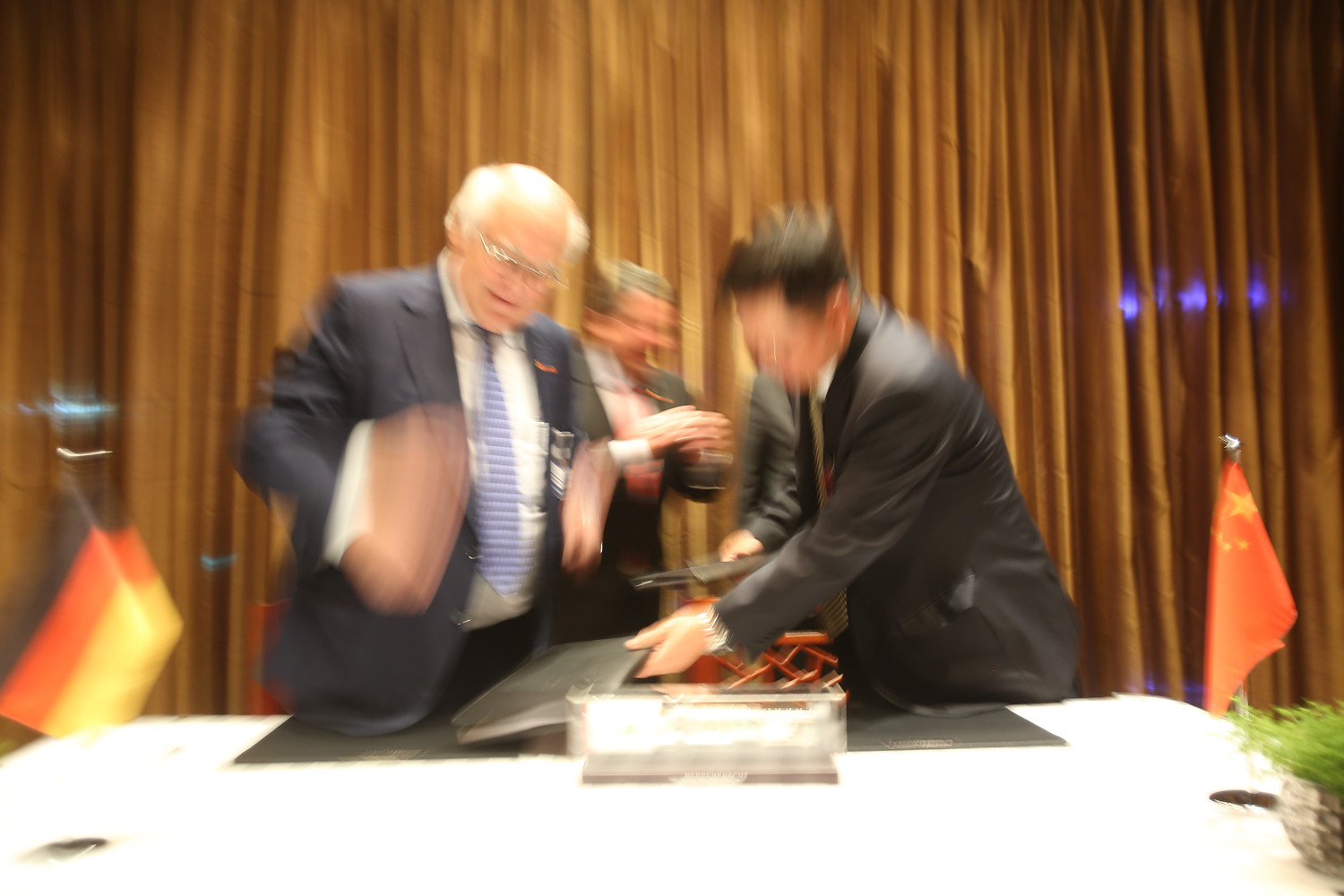 24.04.2014, Germany, China, Kunshan, Bundesvizekanzler Sigmar Gabriel erlebte , wie einer der erfolgreichsten Mittelständler Deutschlands souverän die Show an sich ziehen kann. Kurz vor dem Abflug unterzeichnete Herrenknecht selbst einen 75 Millionen Auftrag für sein badischer Tunnelmaschinenunternehmen. Während sich die Journalisten noch am suessen Buffet der AHK Shanghai erfreuten, knallte ein lachender Herrenknecht nach der Unterzeichnung den Augenzeugen ins Ohr. Dear Mr Xi , I am very sorry, that you have to pay now 75 Mill. Euro. But the people will be glad with our machines. And more important my wife too. Der deutsche Mittelstand, wertbestaendig!!