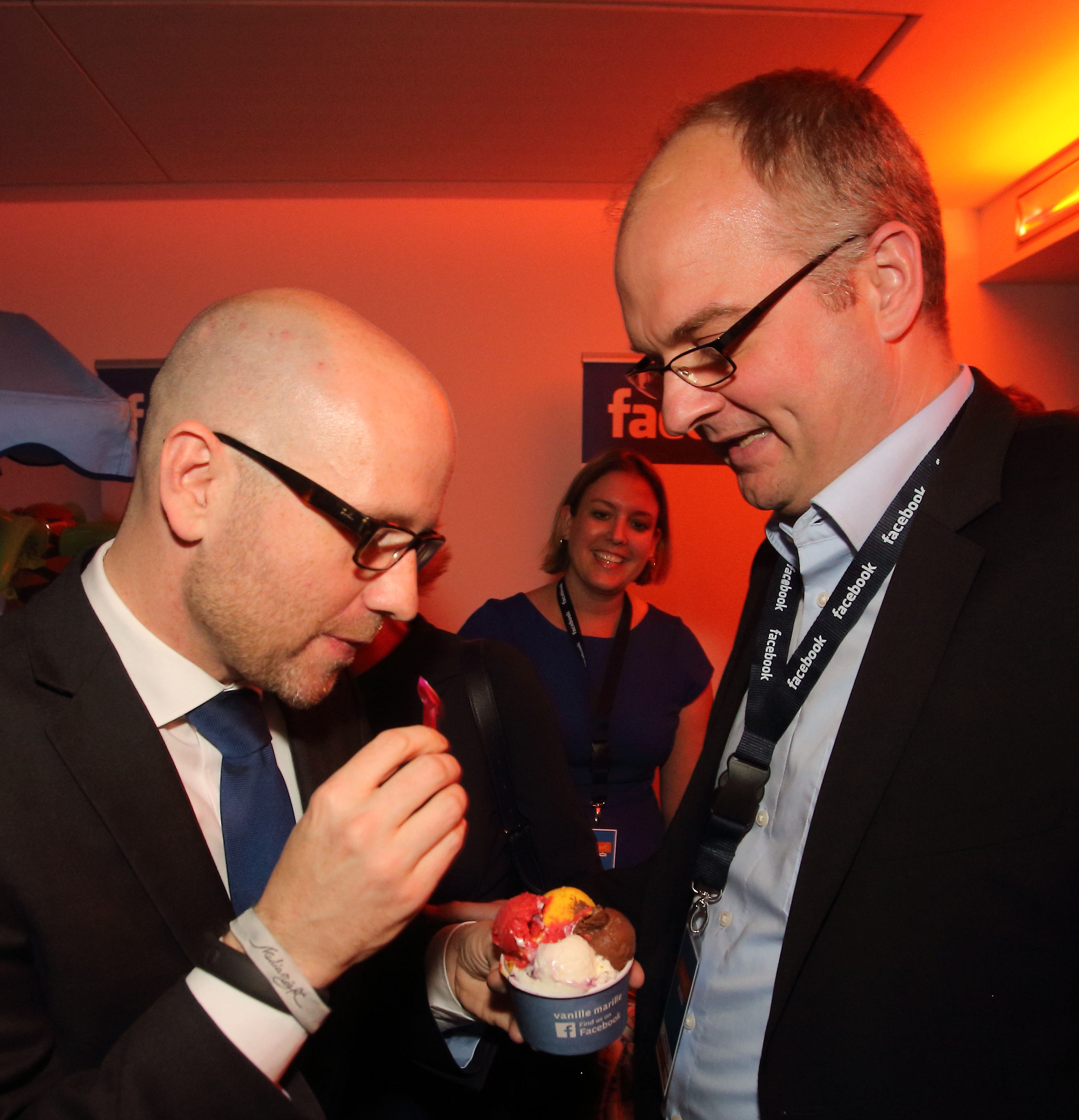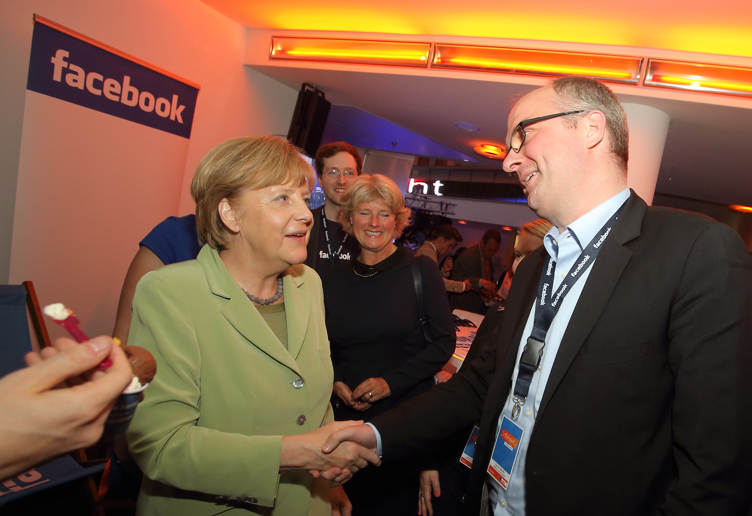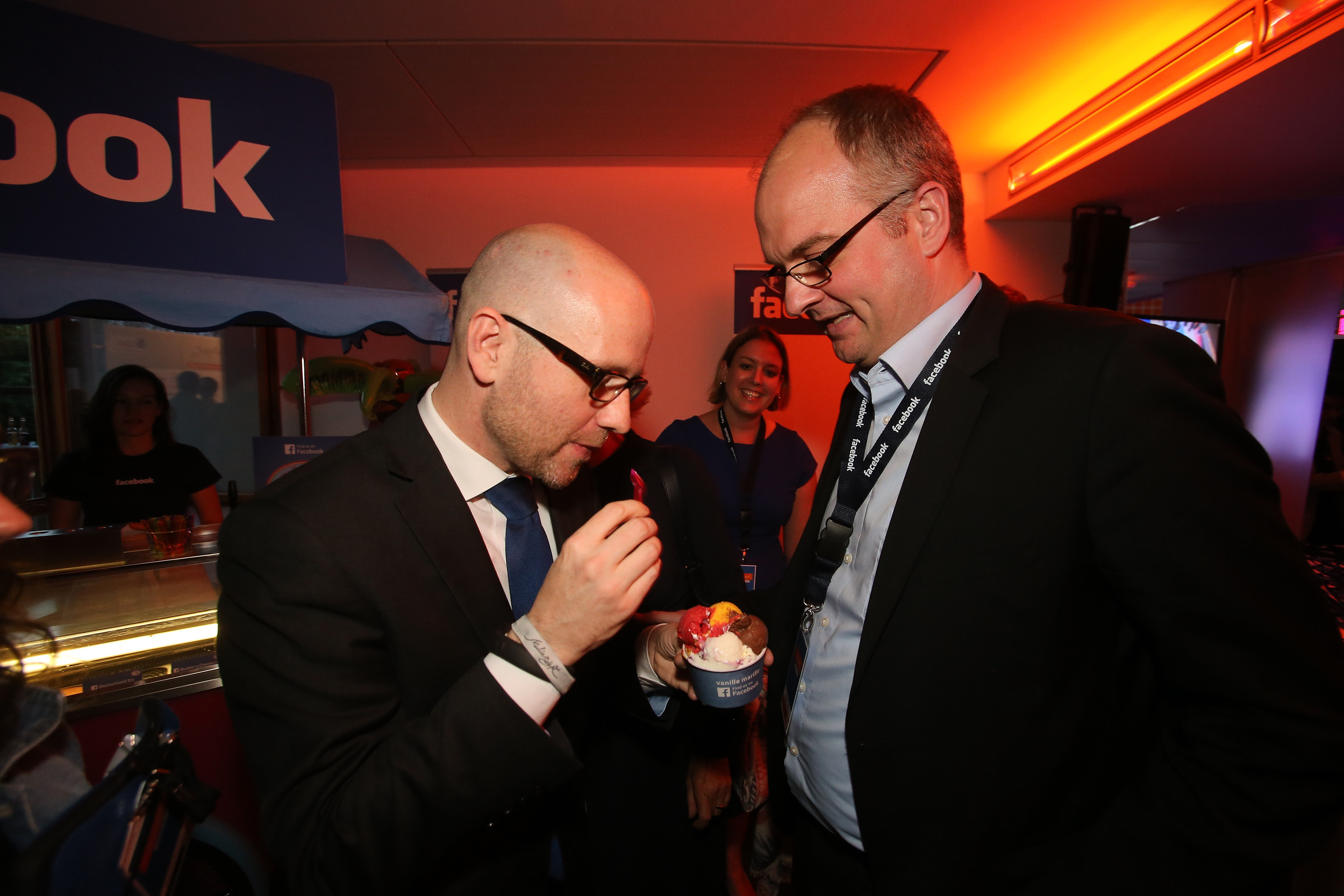 07.05.2014, Germany, Berlin, MediaNight 2014, Bundeskanzlerin Angela Merkel und GS Peter Tauber mit Monika Grueters am FACEBOOK Stand zur Eroeffnung einer ICE Bar, die als Mittelstaendler ihren Ursprung auf FACEBOOK genommen haben. Und alles war wie frueher unter Hemut Kohl, Peter Tauber bekam den Auftrag das Eis zu essen. Das war sonst die Aufgabe von Peter Hintze, auch der machte dies immer sehr gerne. Aber es hat auch einen normalen Grund, wie man nachlesen konnte. Die Kanzlerin ist noch auf guter Diaet zur besseren Genesung nach ihrem Skiunfall. IKn jedem Fall freuten sich FACEBOOK Gunnar Bender und FACEBOOK Global Policy Katie Harbarth riesig ueber den Besuch und den Meinungsaustausch.