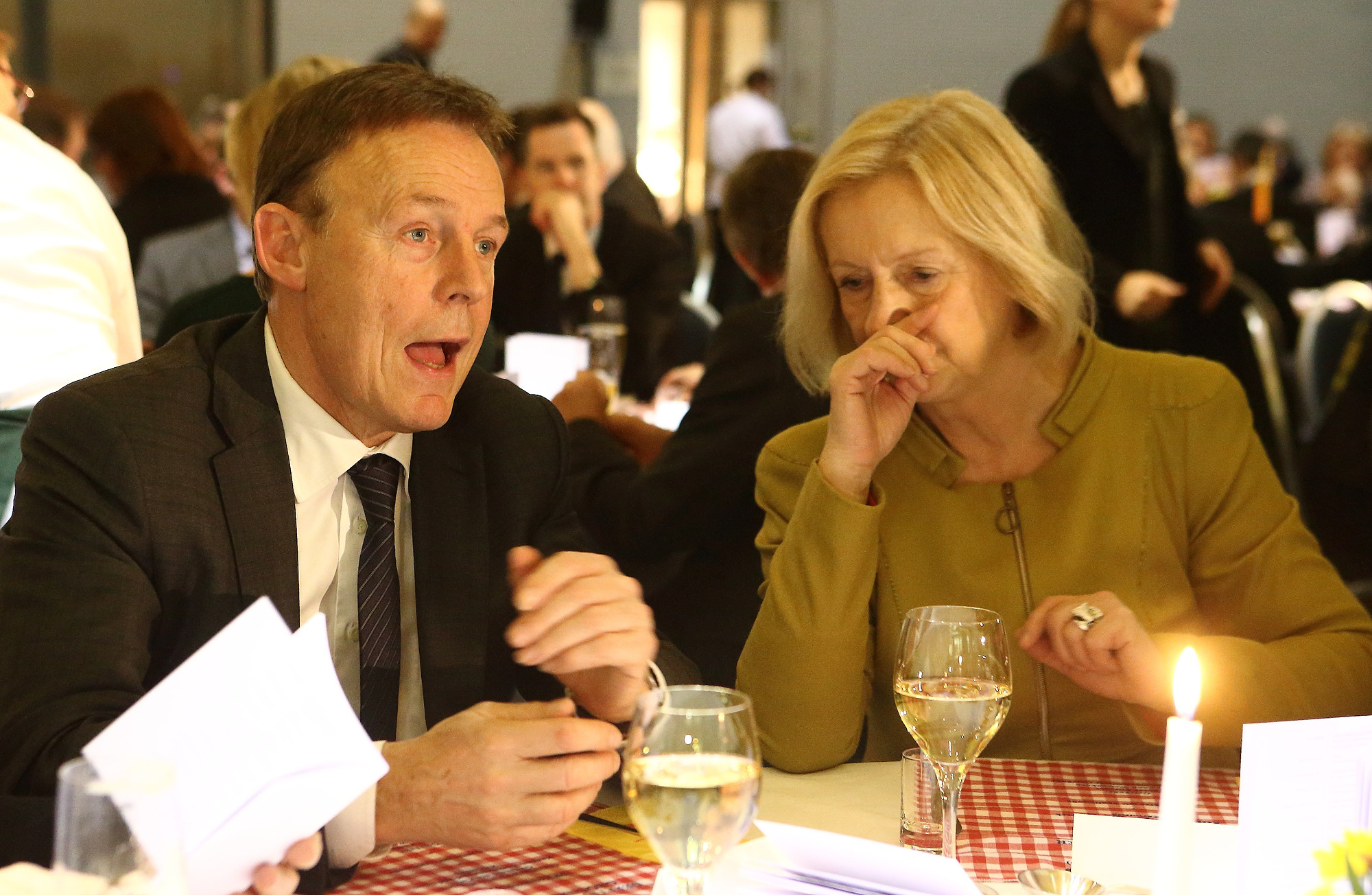 02.02.2015, Germany, Berlin, LV Niedersachsen, 58. Gruenkohl Essen mit Proklamation Gruenkohl Koenig mit neuem OB Juergen Krogmann und dem neuen Gruenkohlkoenig Stephan Weil, Bundesministrerin Wanka, Dietmar Wischmeyer und der ehm. Gruenkohlkoenig der tuerk. Botschafter Kavni Karslioeglu. Sowie bei den Gaesten Thomas Oppermann, ex OB Dietmar Schuetz, Maria Flachsbarth, Hermann Kossendey, Matthias Brueckmann EWE, hier treffen sich 2 ehem. Niedersaechsische Wissenschaftsminister, sagt Sie zu ihm: Niedersachsen bekommt heute wieder einen Monarchen? Er voller Angst: Hat das Auswirkungen für die Sozialdemokratie? Sie: Glaube ich nicht , alles suedlich von Hannover wird wohlwollend betrachtet! Er, erleichtert aber auch mit einem Gedankenblitz: Goettingen ist klar , aber auch Goslar?