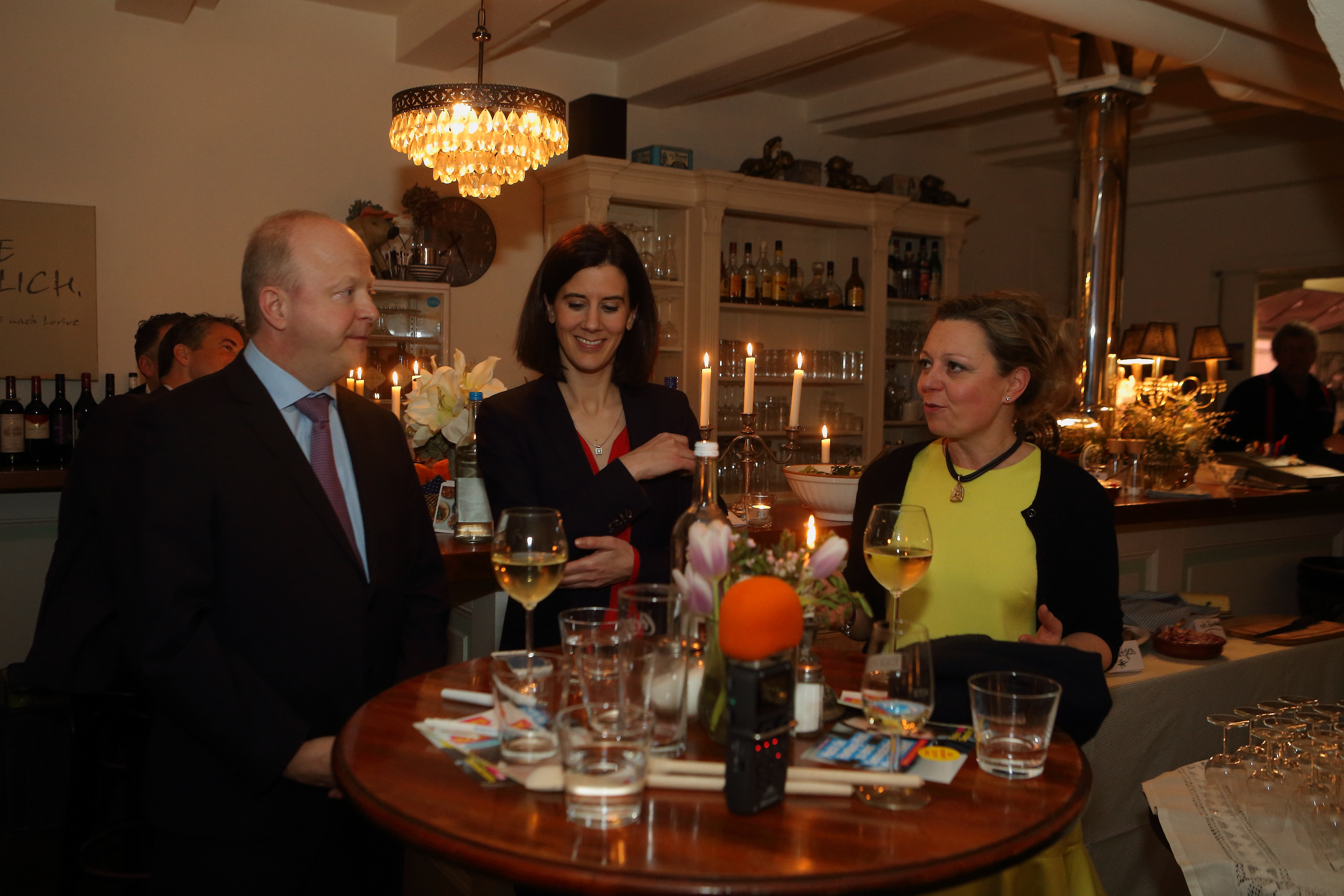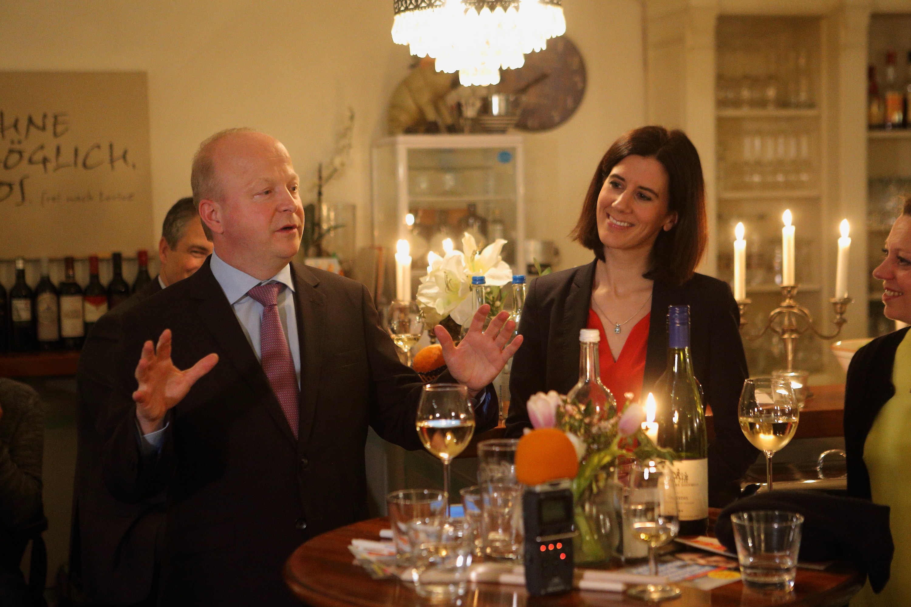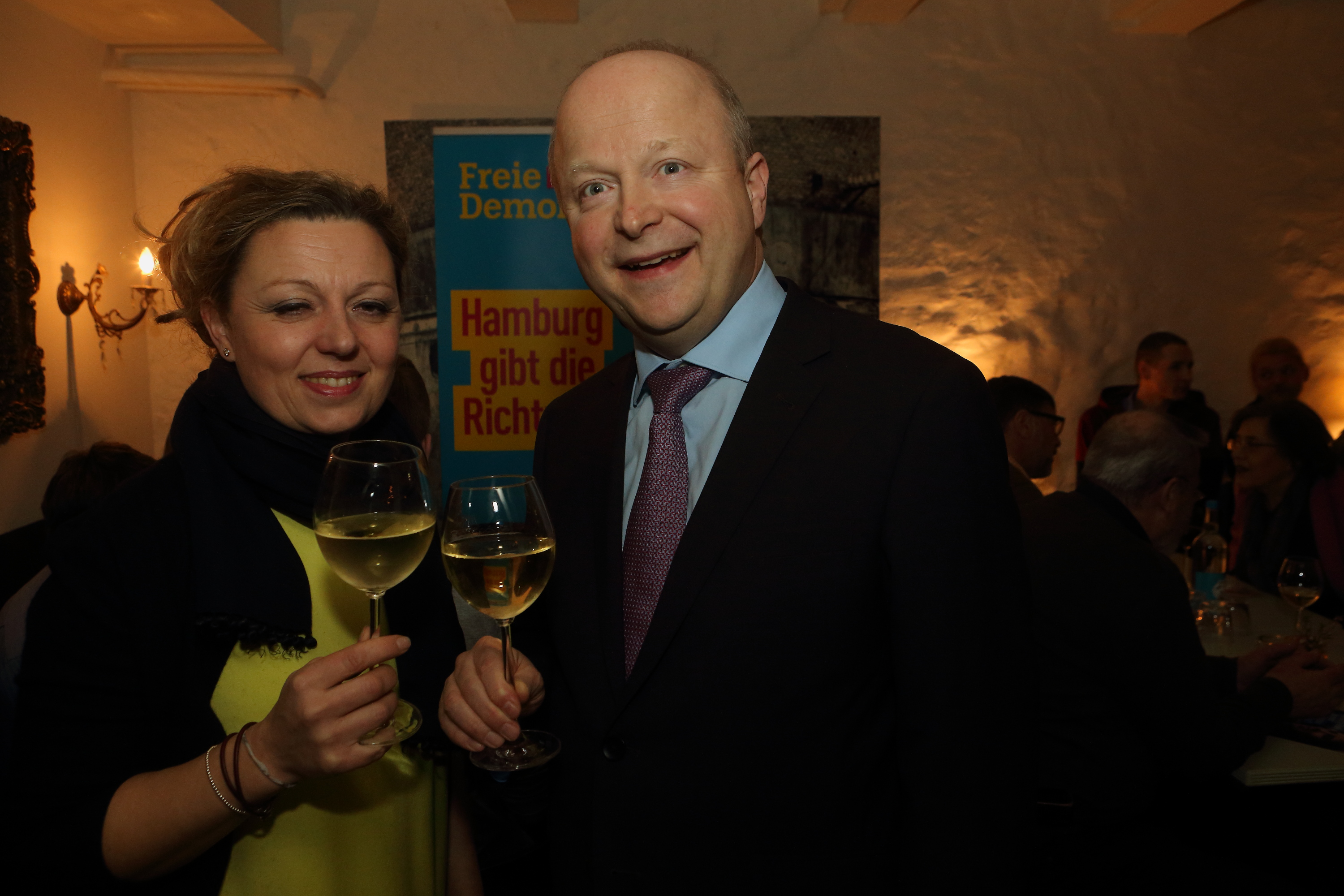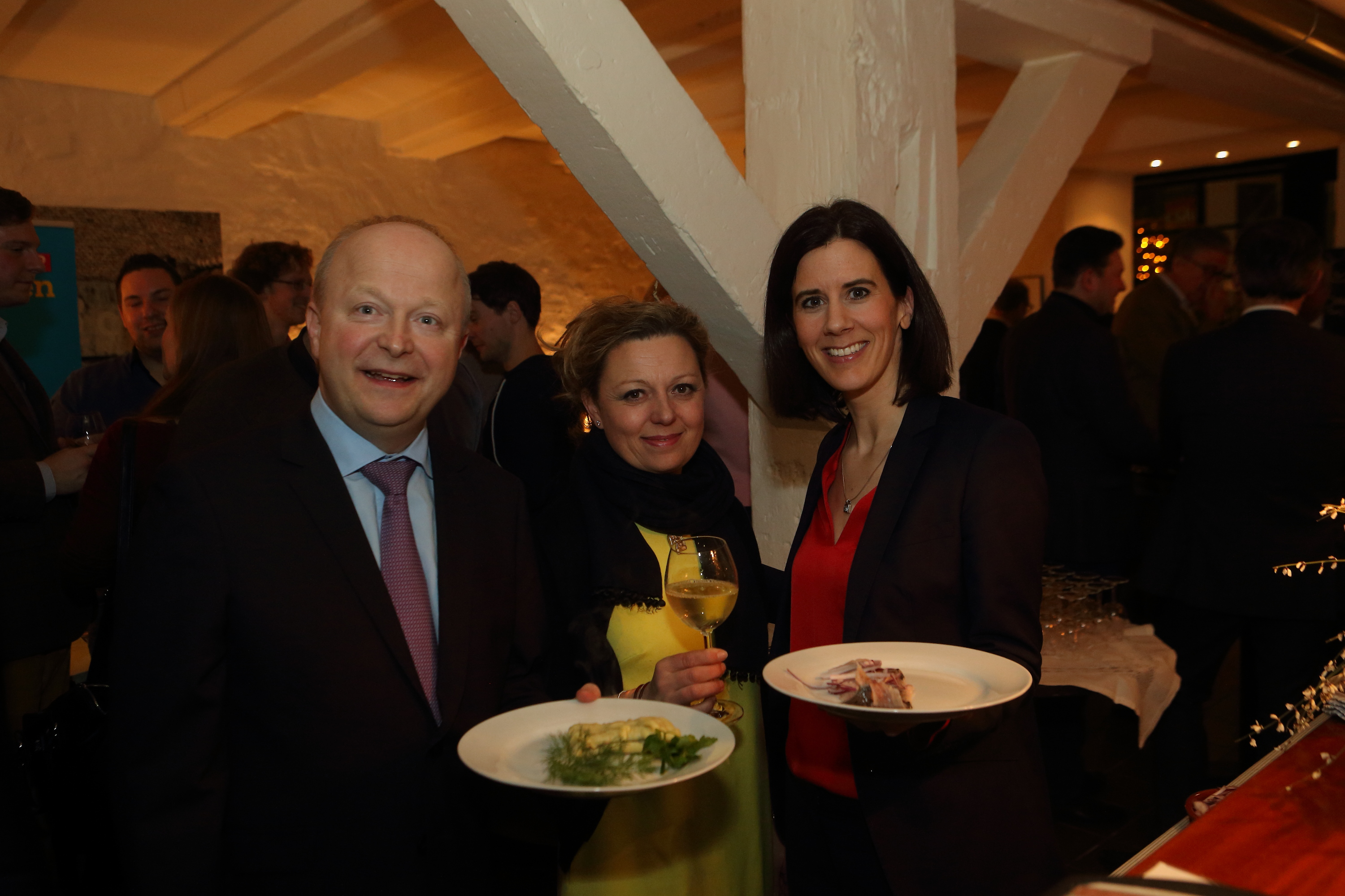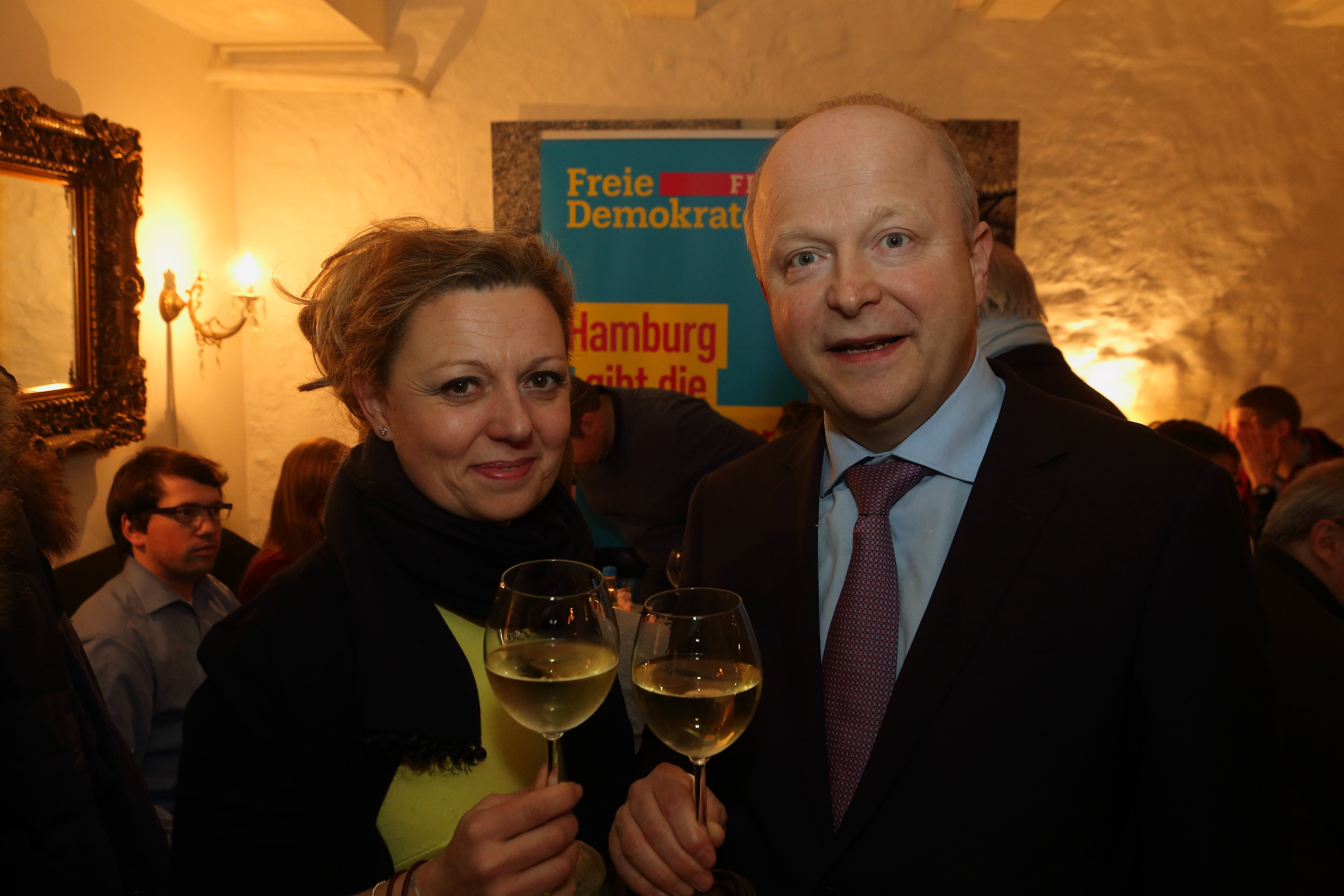 11.02.2015, Germany, Hamburg, FDP im Ha,burg Wahlkampf, Michael Theurer , FDP Landesvorsitzender Baden Wuerttemberg, laedt ein zur Matjes meets Maultaeschle Veranstaltung im Restaurant Perle ,Spitzenklandiatin Katja Suding und der Star Sommiliere Natalie Lumpp aus Baden Baden. Und es mundete mit den Beiträgen ; Hafenausbaui, Elbvertiefung und Hochschulpolitik sowie fruehkindlicher Bildung. Theure eher pragmatisch mit den Bruesseler Themen TTIP , Mittelstaendische Wirtschaft und Innovationskraft und ihre Foerderung. Natalie Lumpp beriet die Gaesten dann in dem was vielleicht in den anderen Beitraegen fehlte , die Steillagen und ihre CHance fuer den Sauvignon Blanc. Ein Wein den sie dringend der FDP empfiehlt