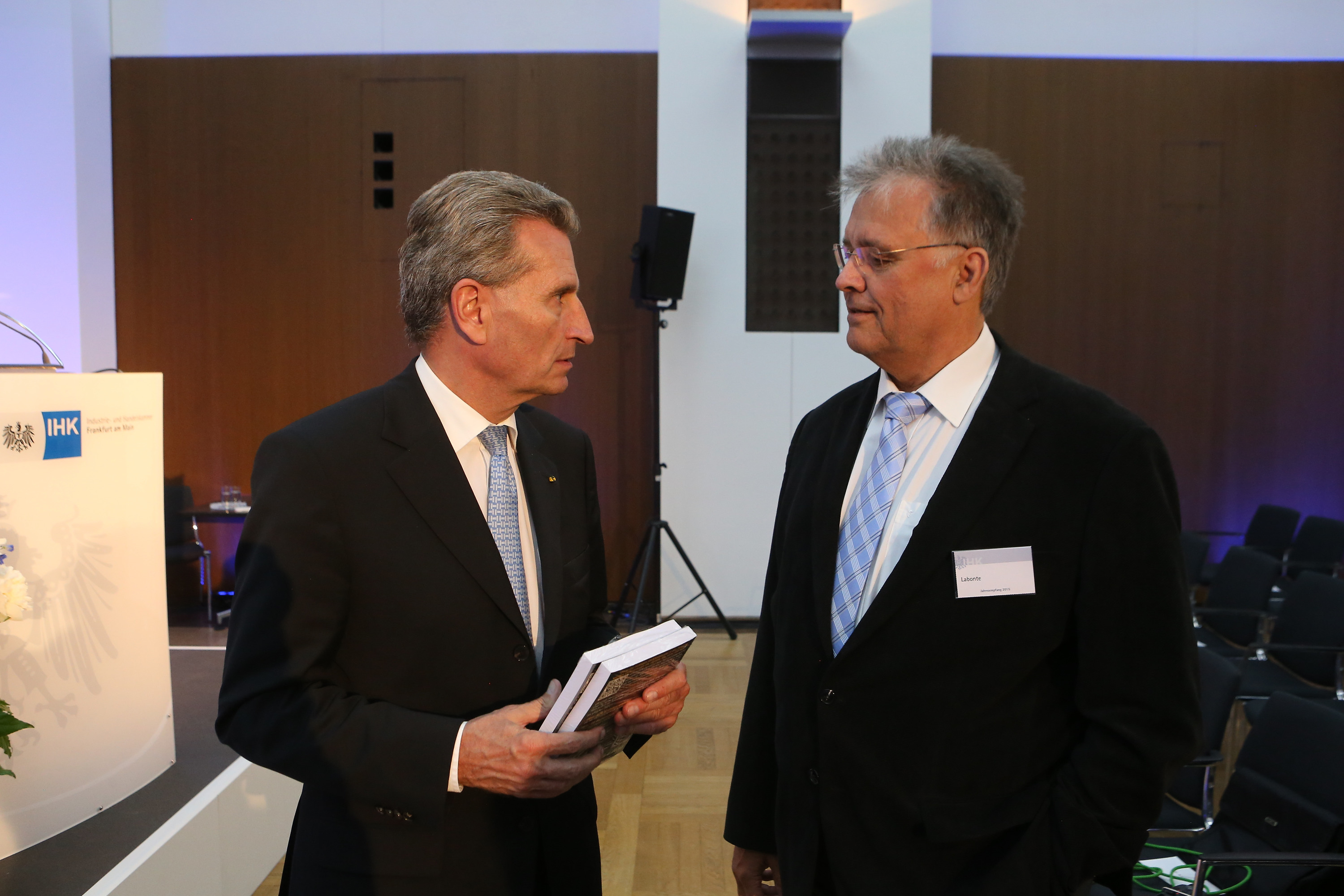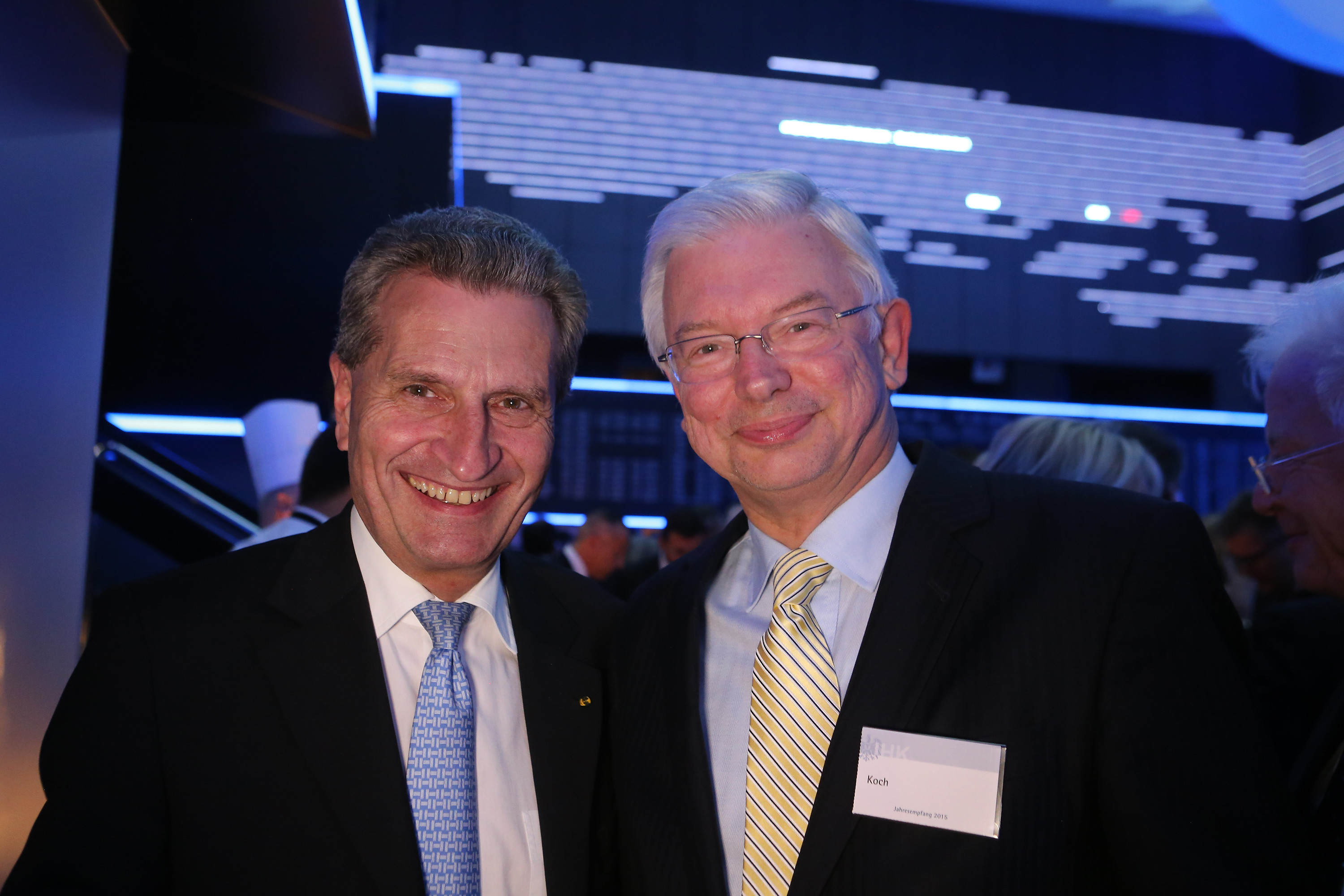 27.05.2015, Germany, Frankfurt, Jahresempfang der IHK FRankfurt am Main, mit den Reden von EU Kommisar Guenther Oettinger , Volker Bouffier, Peter Feldmann(OB FRA), IHK Präsident Müller, sowie Heinz Peter Labonte (Fachverband Rundfunk und Breitband Komunikation, Dirk Metz, ex MP Roland Koch und dem Vorstand der Frankfurter Börse auf dem Parkett, ex Bundesbank Edgar Meister, Eine Rede die es in sich hatte legte Günther Öttinger vor den rund 3500 Gästen in 4 Übertragungssälen hin. Es war eher eine der modernsten Wach Rüttel Reden, die er inzwischen in so großen Teilen auch in English brilliant darlegt. Er geht nicht über seine Schwächen hinweg, um das Auditorium mitzunehmen. Da blieben Volker Bouffier nur noch ein paar Gedanken zur Nacht und der Frankfurter OB Peter Feldmann redete 13 minuten über die Schwierigkeiten aus seiner Sicht einer Gesellschaft von morgen, das Zusammenlegen von Tarifverbünden des öffentlichen Nahverkehrs. Da waren viele Anwesende, die bei der IHK Frankfurt mit Fahrer angereist waren, natürlich voll beeeindruckt. Vielleicht…im nächsten Leben .
