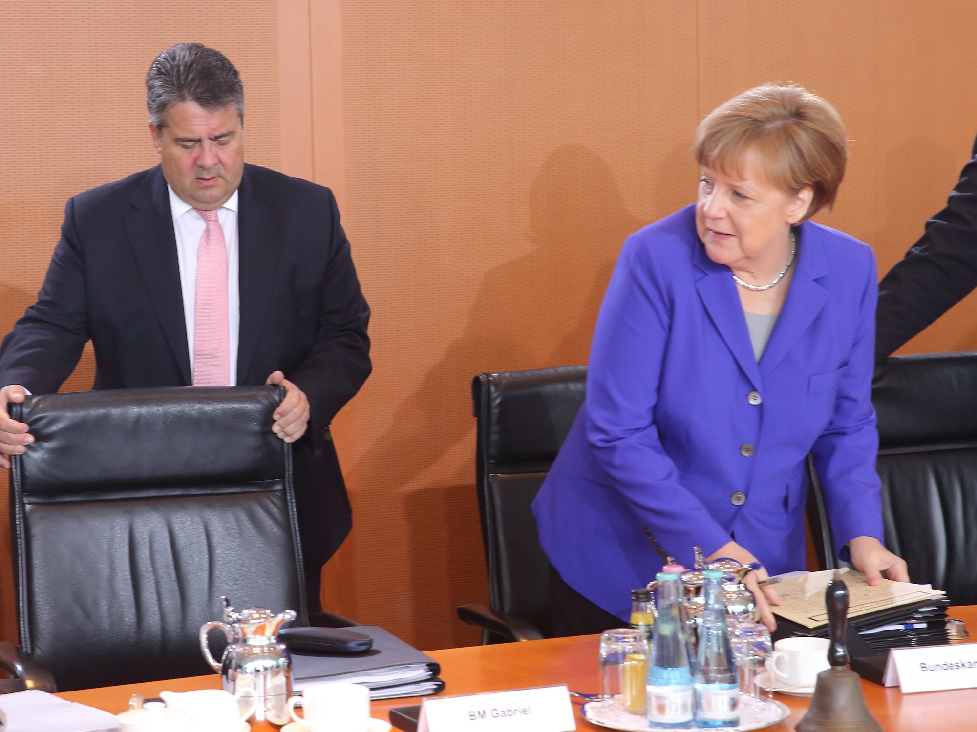 20042016, Germany,Berlin,Bundeskabinett, mit Angela Merkel und Sigmar Gabriel, Frank Walter Steinmeier im Gespraech mit Heiko Maas , Thomas de Maiziere im Gespraech mit Andrea Nahles und dann mit Heiko Maas, Ralf Brauksiepe, Sts. im Bundesverteidigungsministerium, Rita Schwarzeluehr Sutter, Sts. im Umweltministerium, 2 Hessen am Kabinetstisch, SPD Michael Roth und CDU Helge Braun, © Frank Ossenbrink Media
